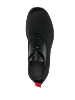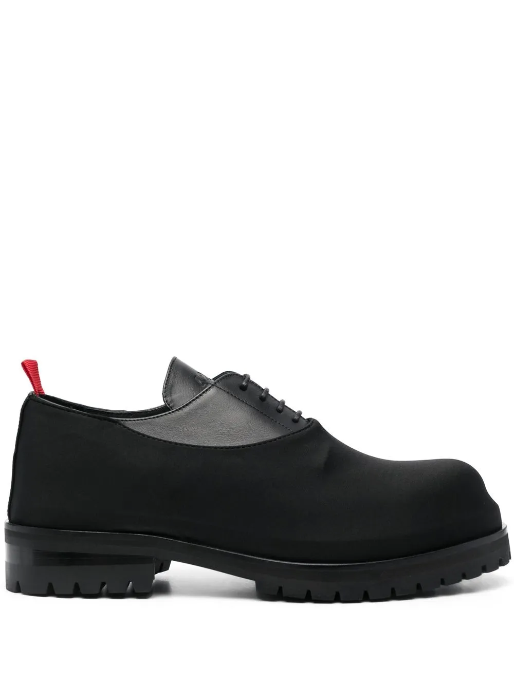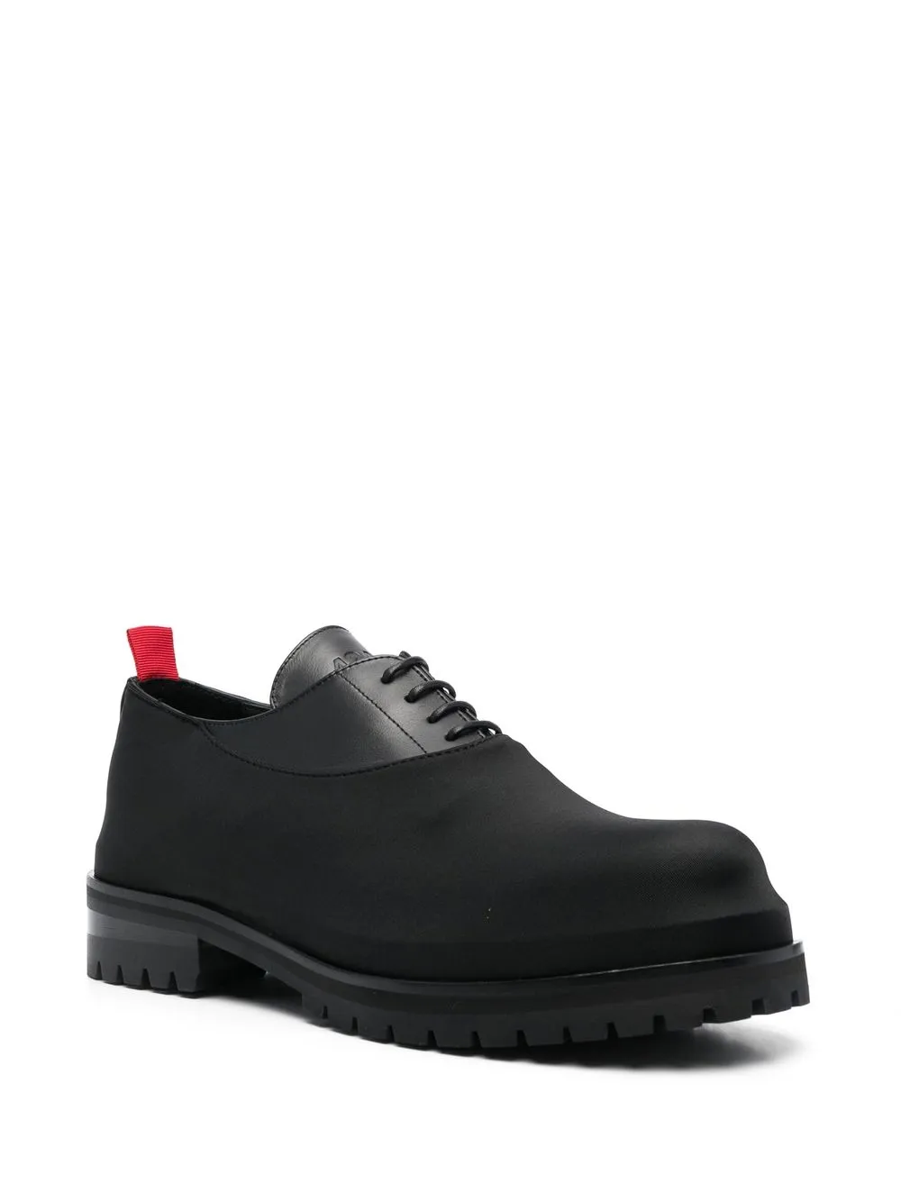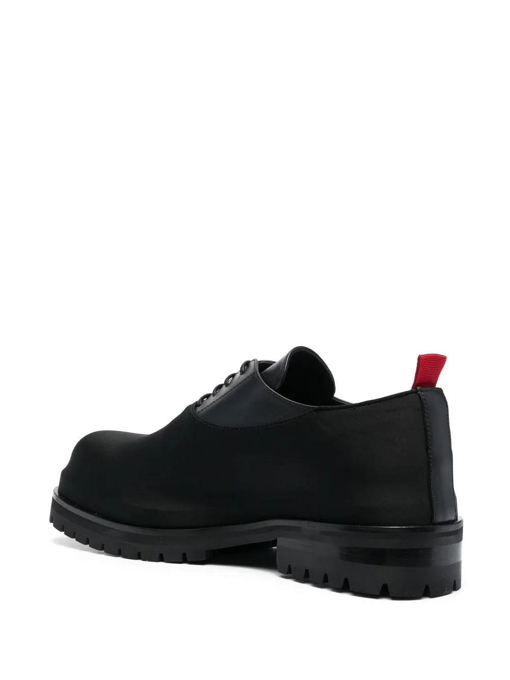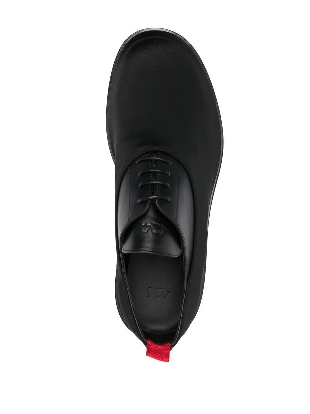 overlapping-panel leather derby shoes from 424 featuring black, calf leather, overlapping panel, logo-debossed tongue, pull-tab at the heel, round toe, front lace-up fastening, branded insole, ridged rubber sole and low ridged heel.
