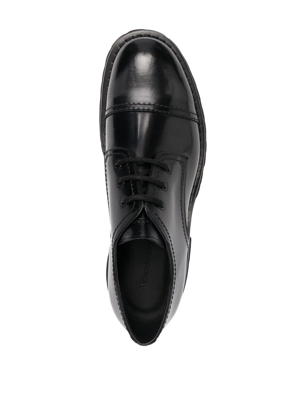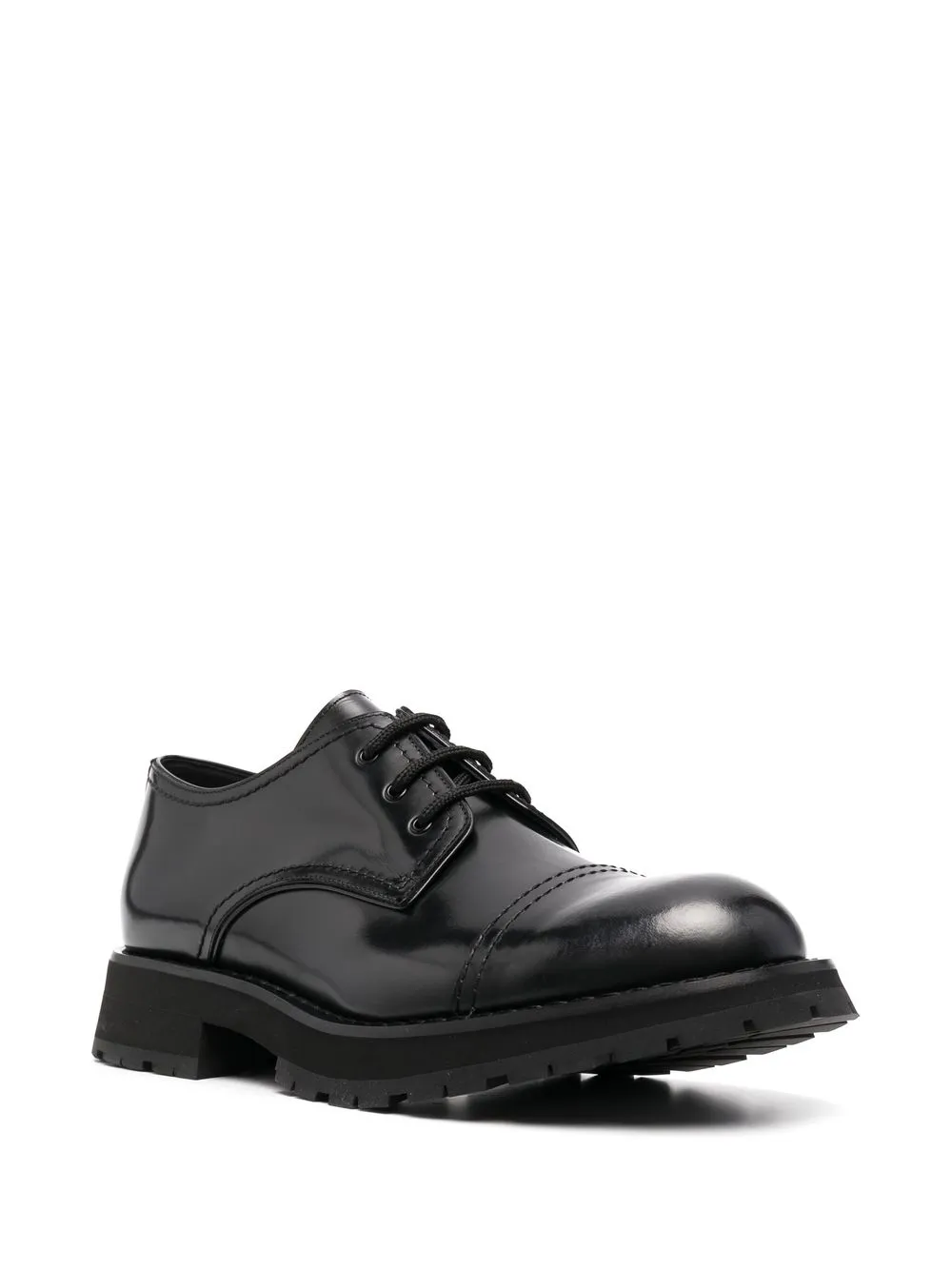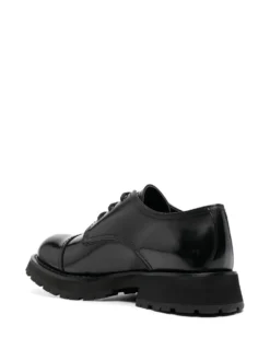 chunky-sole derby shoes from Alexander McQueen featuring black, leather, logo-embossed tongue, round toe, front lace-up fastening, branded insole and chunky rubber sole.