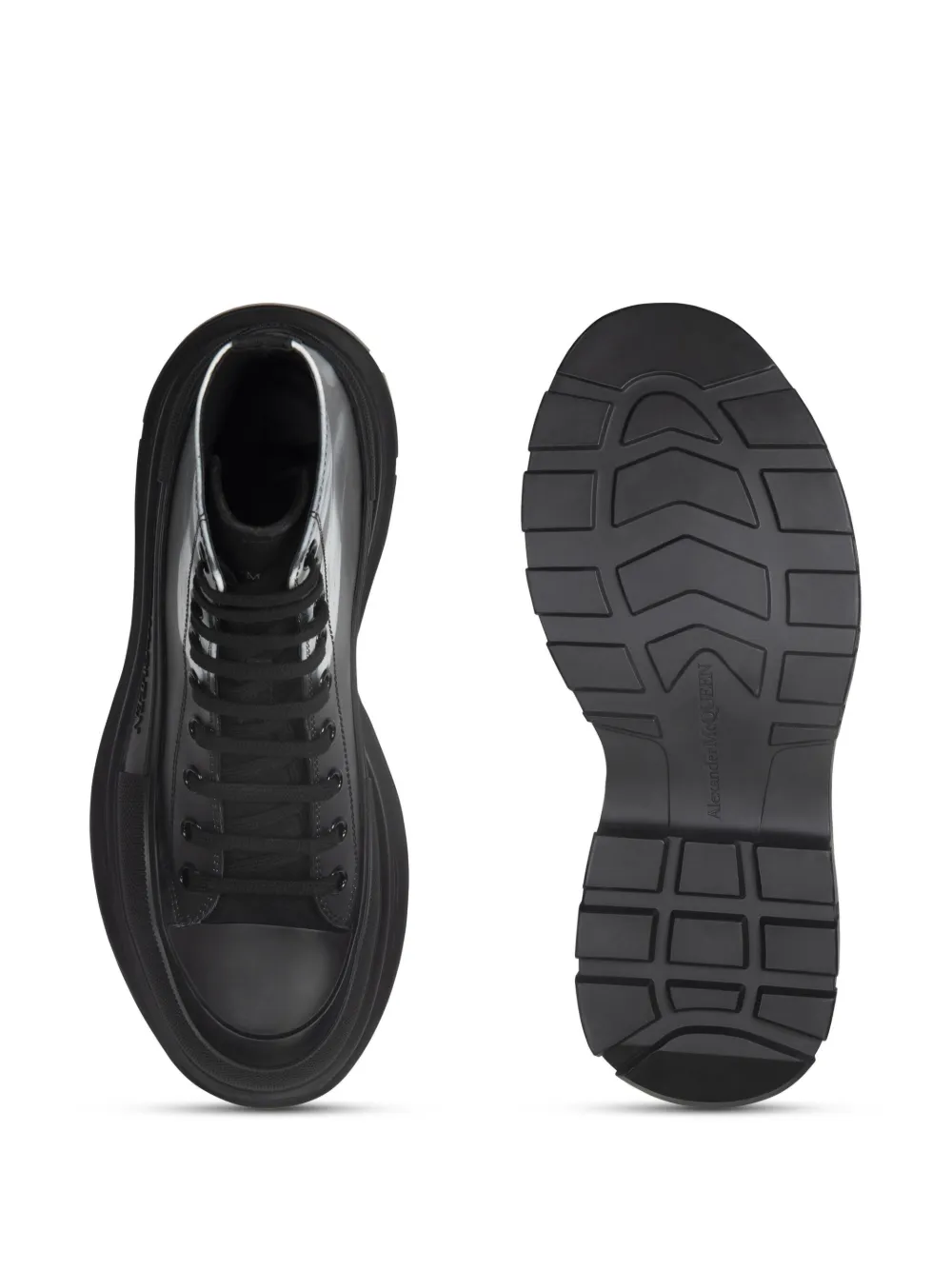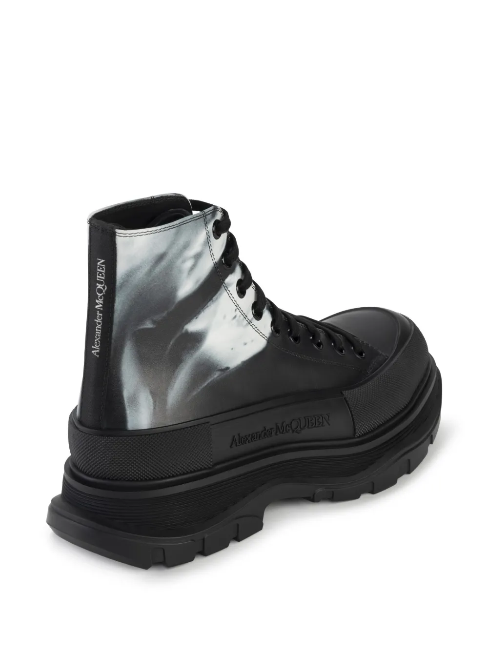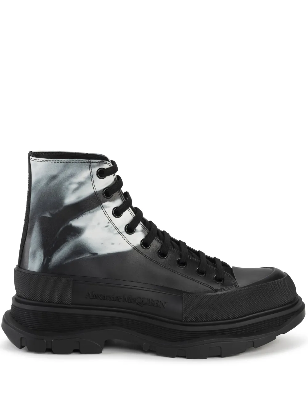 Featuring the most prominent motif of Alexander McQueen’s AW23 collection, the orchid print in black and white appears stamped across this iteration of the brand’s iconic Tread Slick ankle boots.