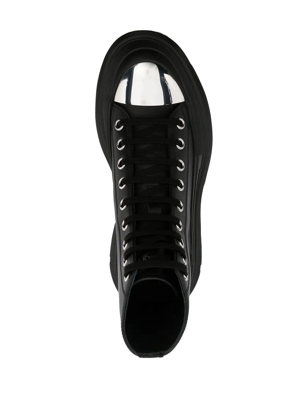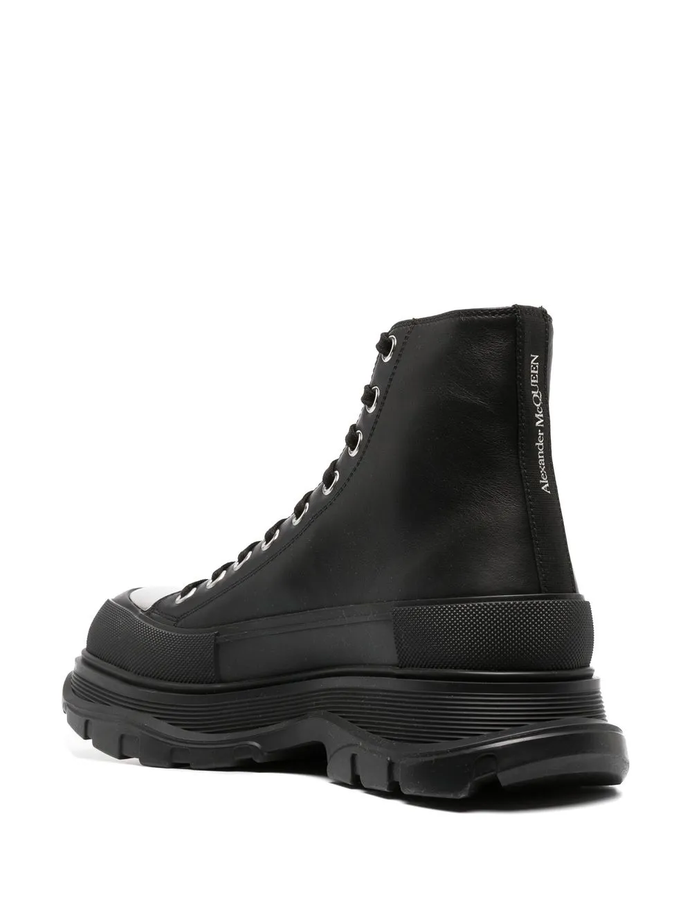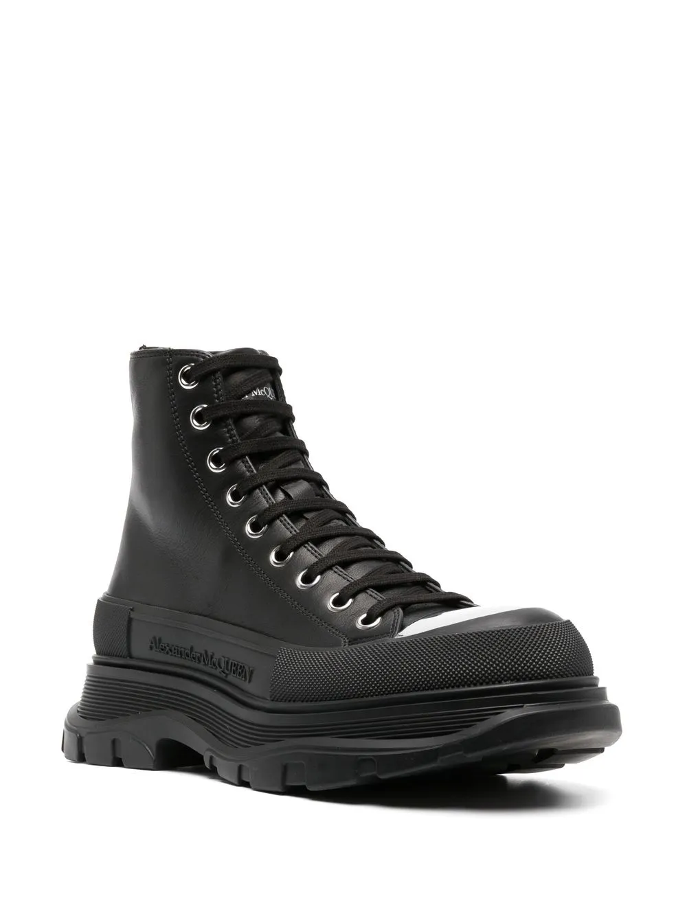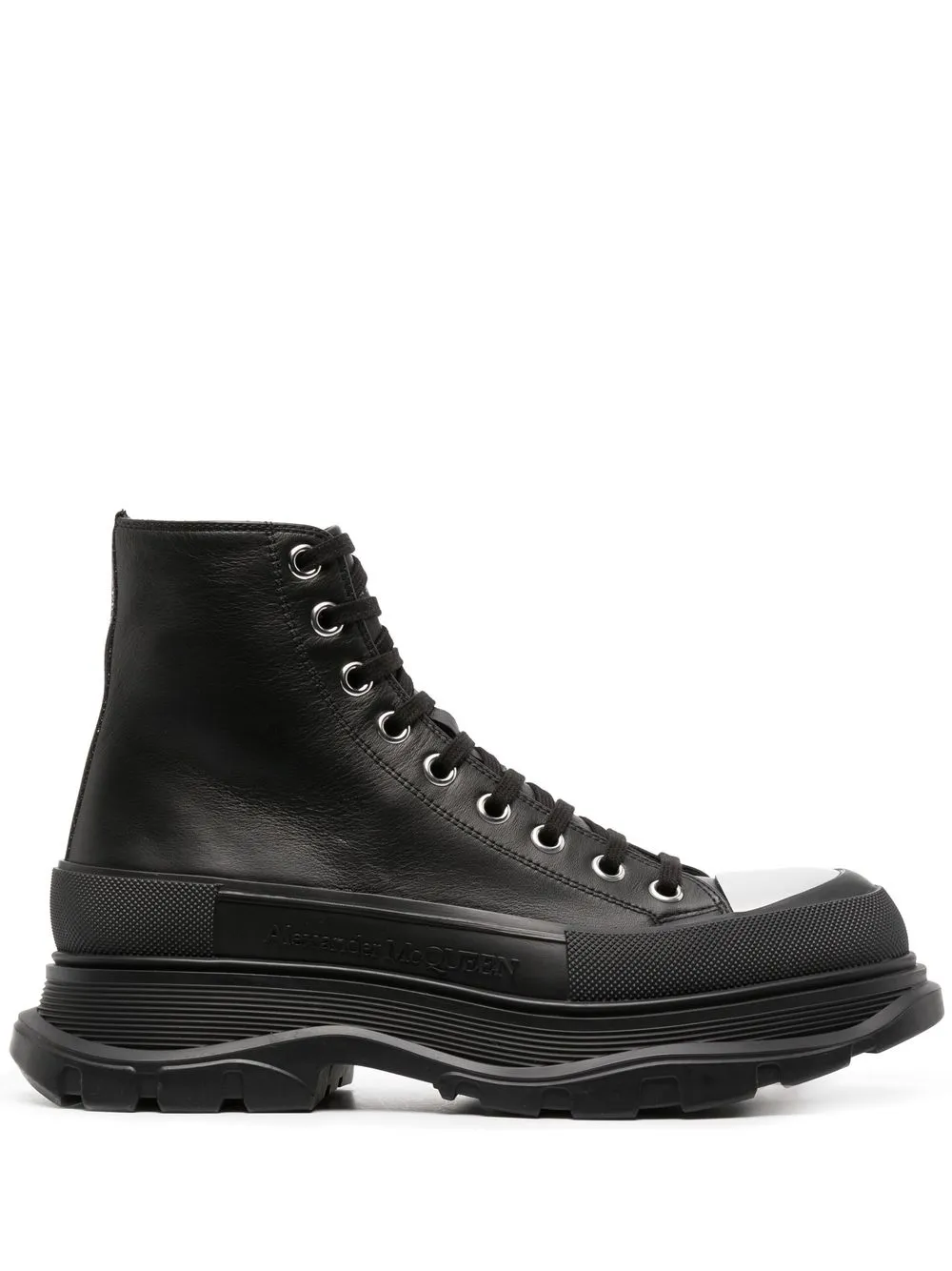 Tread Slick lace-up boots from Alexander McQueen featuring branded heel counter, front lace-up fastening, ankle-length, round toe, chunky rubber lug sole, black and calf leather.