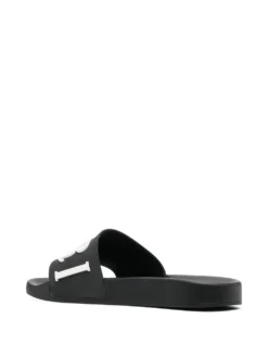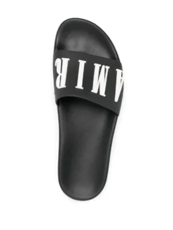 logo-embossed slides from AMIRI featuring black/white, flat rubber sole, embossed logo to the front, moulded footbed and open toe.