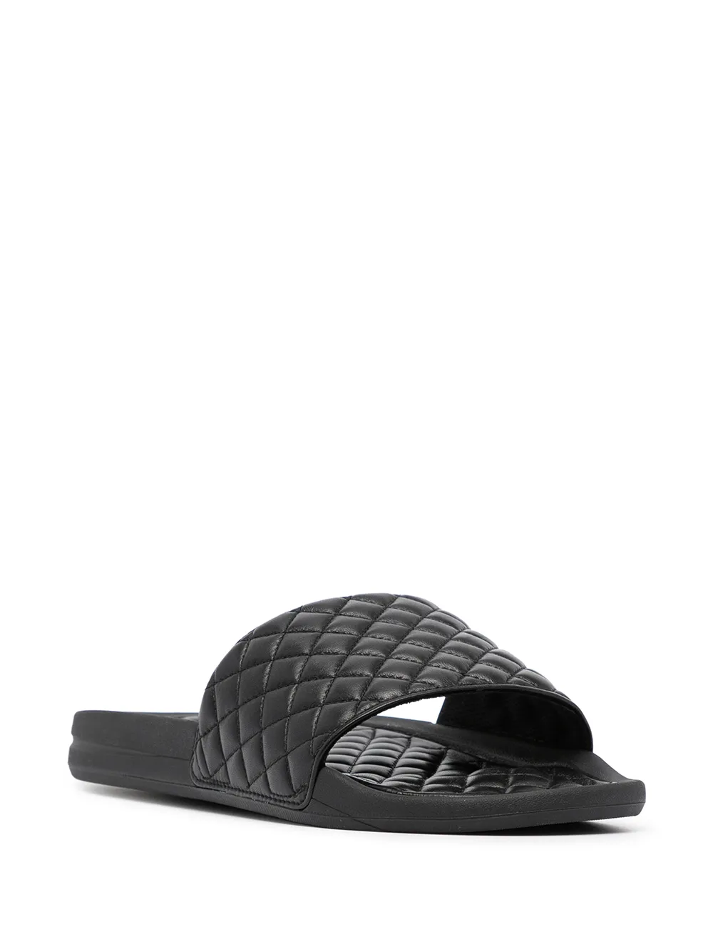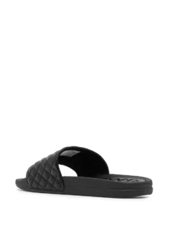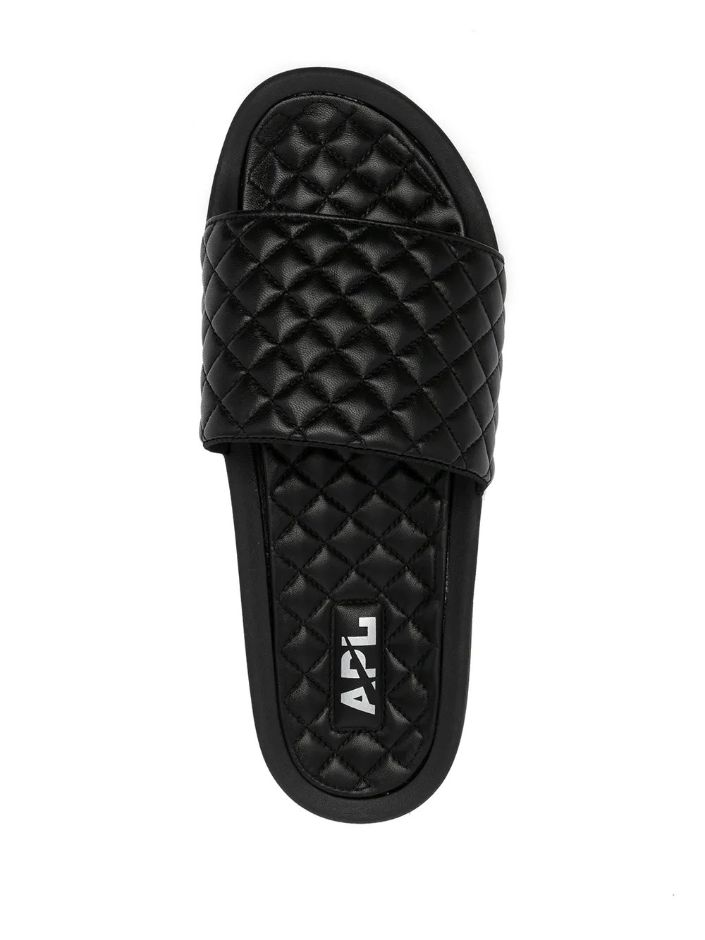 Black leather Lusso flat slides from APL: ATHLETIC PROPULSION LABS featuring quilted finish, open toe, round toe, slip-on style, branded insole and flat rubber sole.