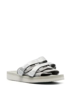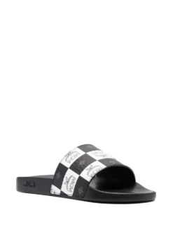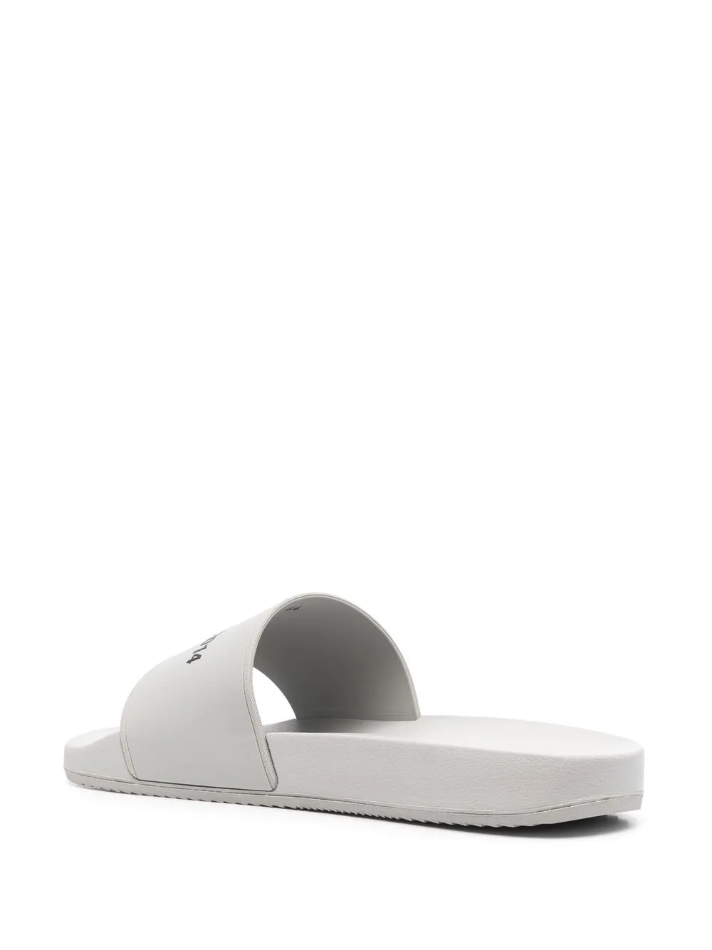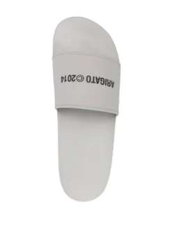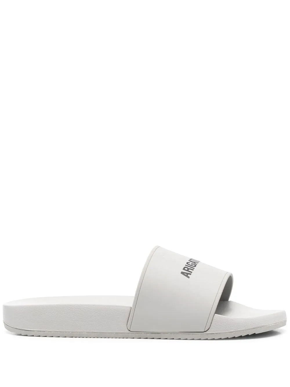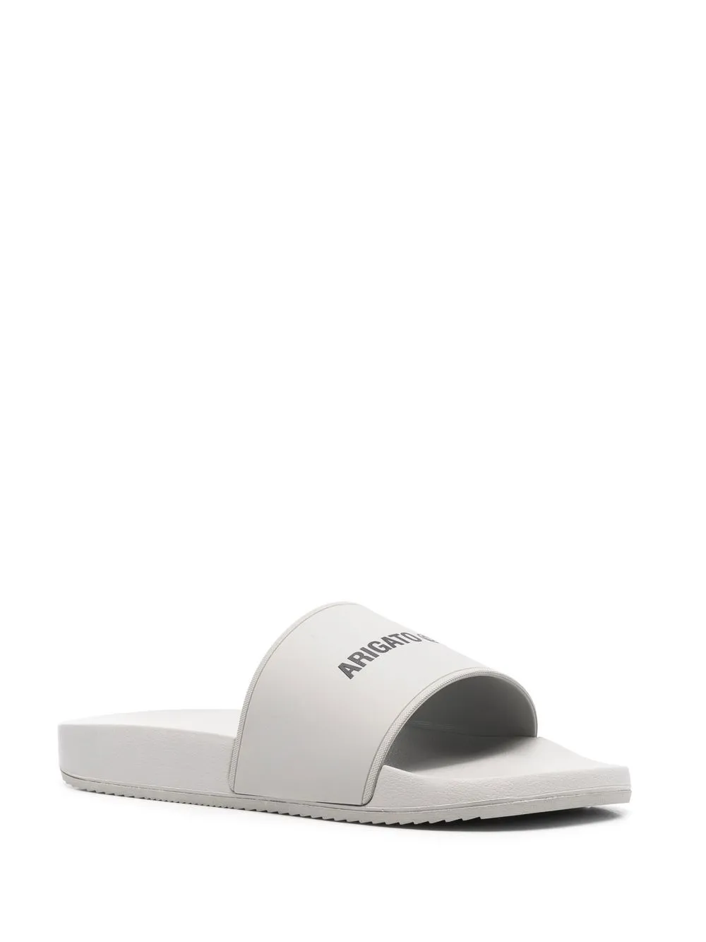 2014 logo pool slides from AXEL ARIGATO featuring grey, logo print to the front, round toe, moulded footbed and flat sole.