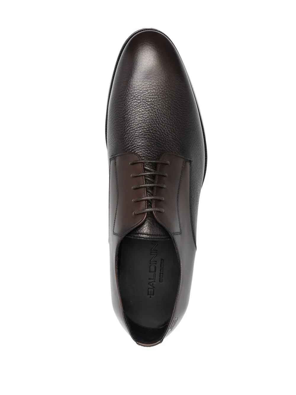 round-toe panelled Derby shoes from BALDININI featuring brown, calf leather, grained texture, panelled design, debossed logo to the side, branded insole, round toe, front lace-up fastening, low block heel and rubber sole.
