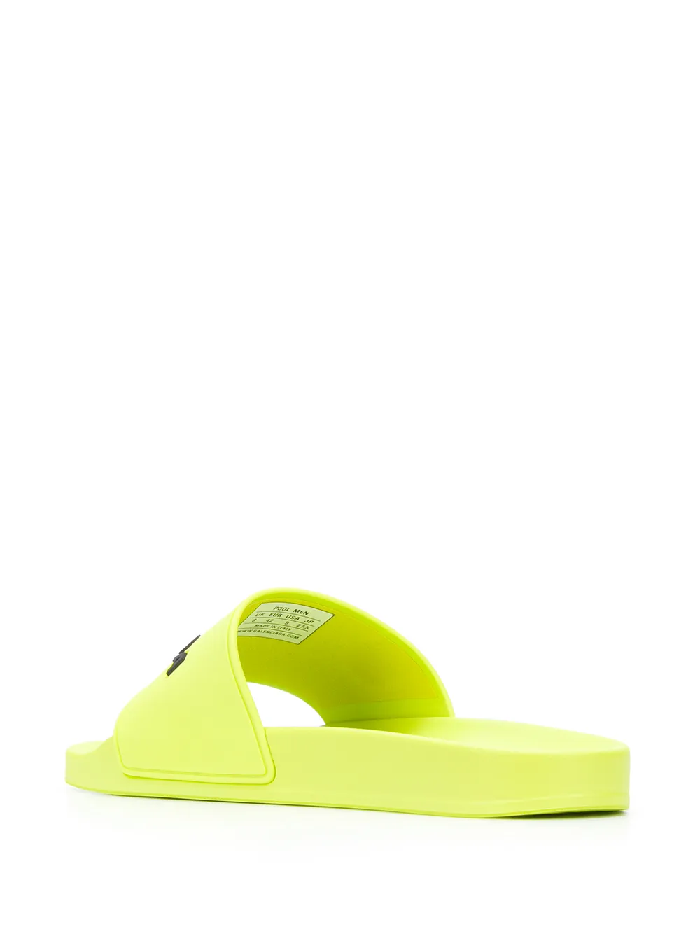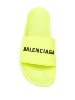 Stay comfy. With the help of these yellow rubber logo slip-on slides from Balenciaga, every step you take is comforted by the moulded footbed. Step forward. Featuring an open toe, a slip-on style, a flat rubber sole and a printed logo.