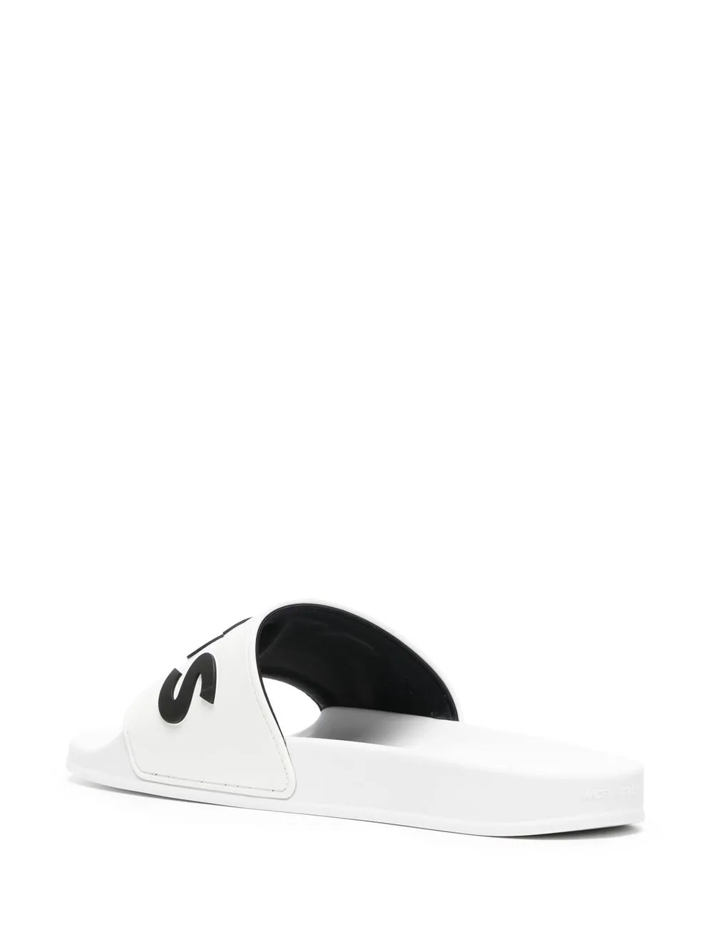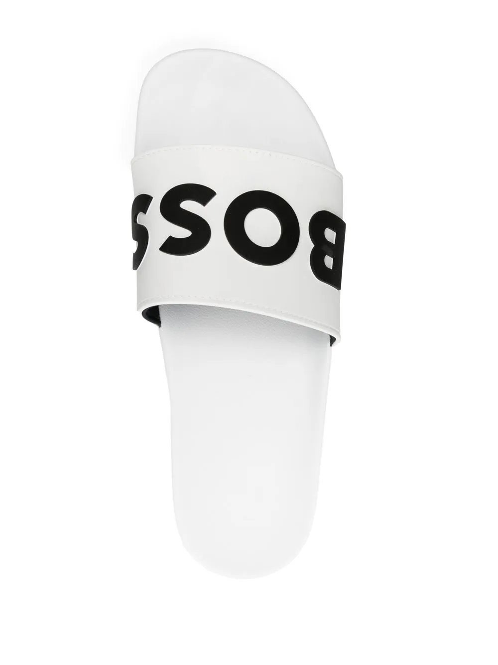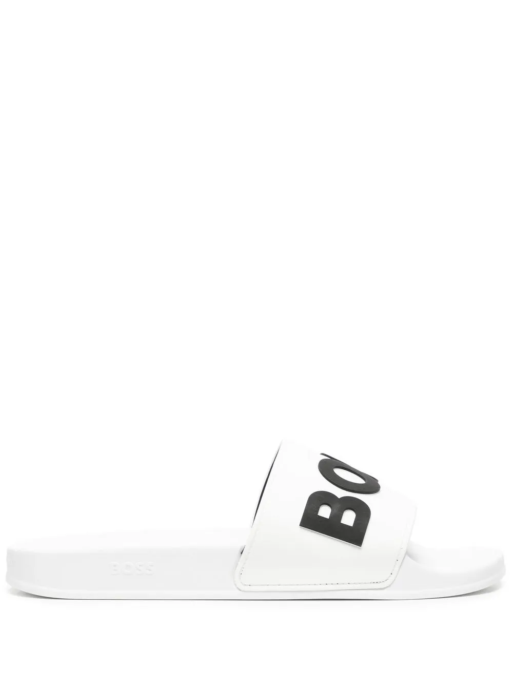 logo-embossed slides from BOSS featuring white/black, embossed logo to the front, moulded footbed, open toe and flat sole.