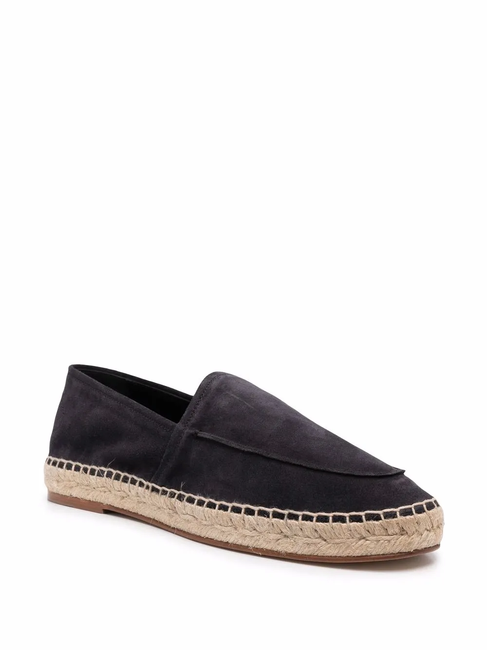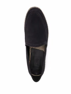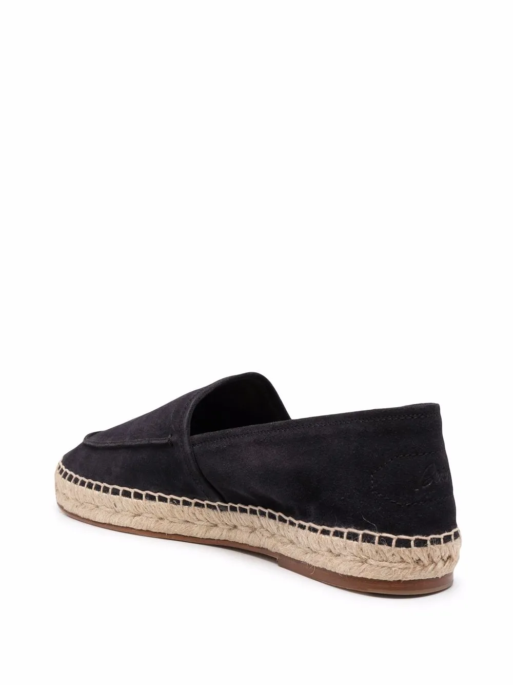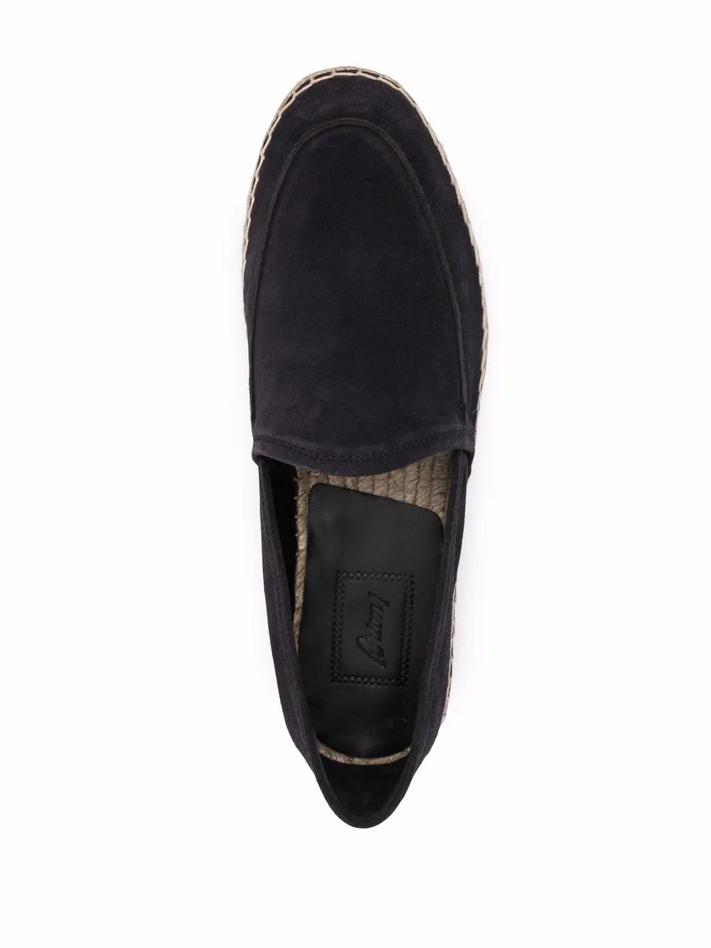 Dark blue leather/suede/raffia slip-on suede espadrilles from BRIONI featuring suede, almond toe, slip-on style, branded insole, braided raffia sole and flat rubber sole.
