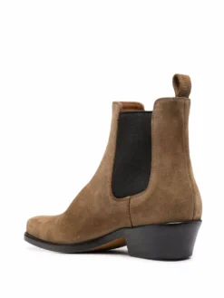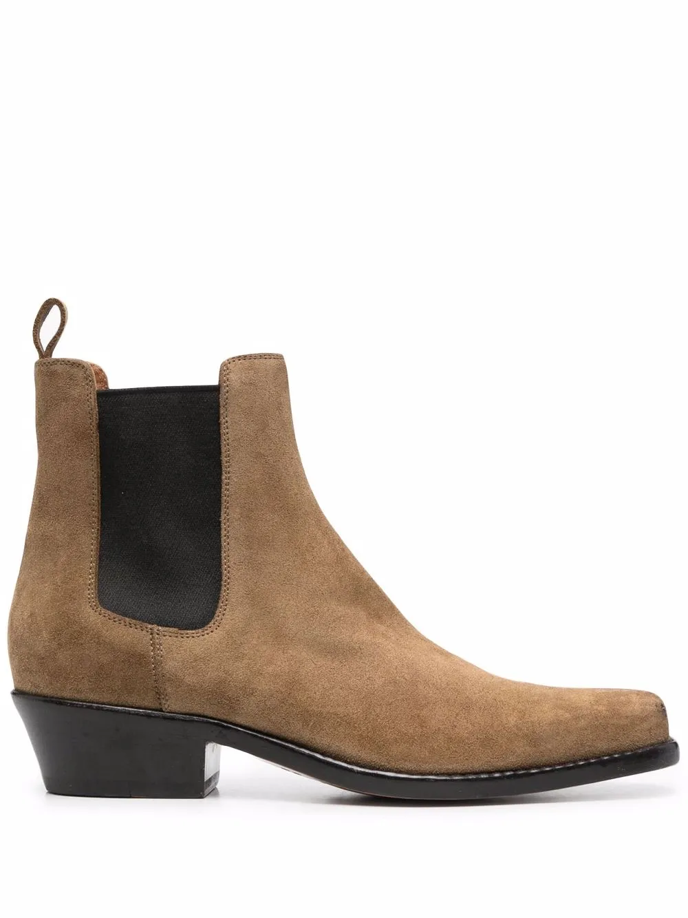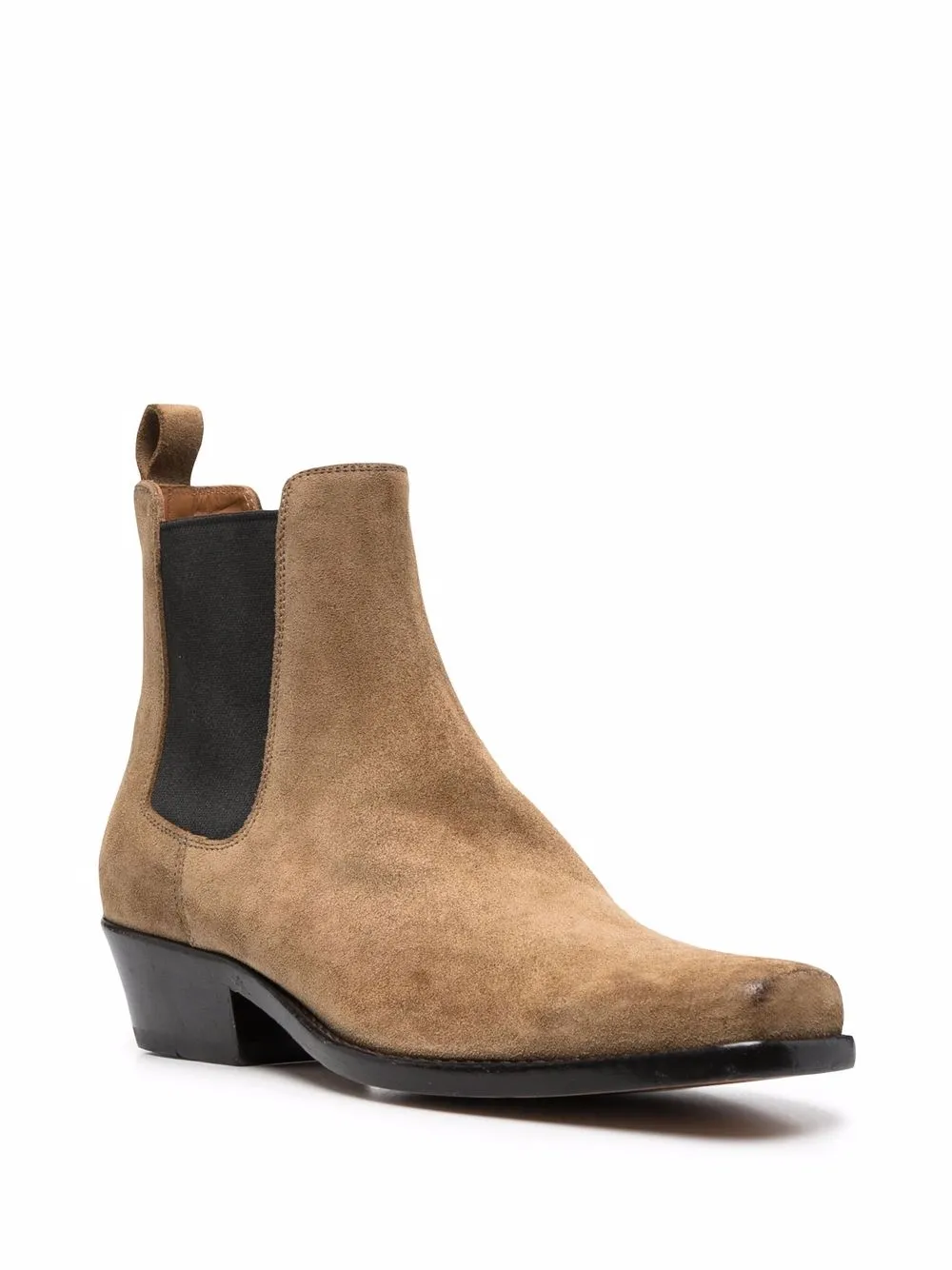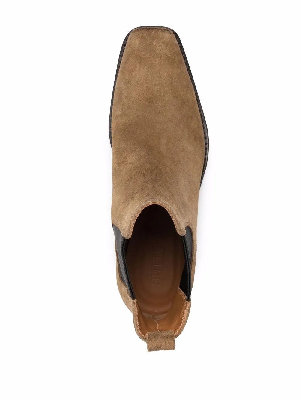 Light brown suede/leather block-heel ankle boots from BUTTERO featuring low block heel, pull-tab at the heel, elasticated side panels and square toe.