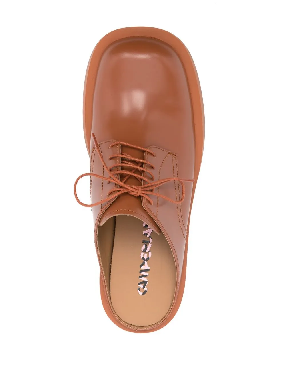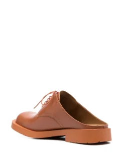 Mil 1978 backless Derby shoes from CamperLab featuring camel brown, leather, square toe, front lace-up fastening, flat rubber sole, low block heel and branded insole.