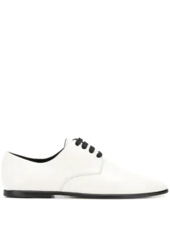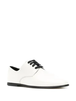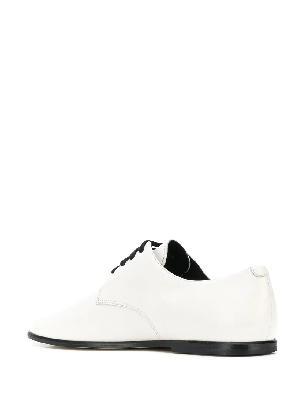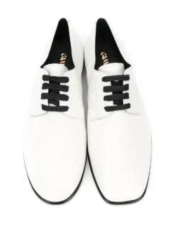 White leather Twins derby shoes from CamperLab featuring a branded insole, a lace fastening, an almond toe and a square toe. POSITIVELY CONSCIOUS: The leather of this product has been produced in an audited and certified Leather Working Group tannery – scoring Silver, so you can be confident you are choosing positively.