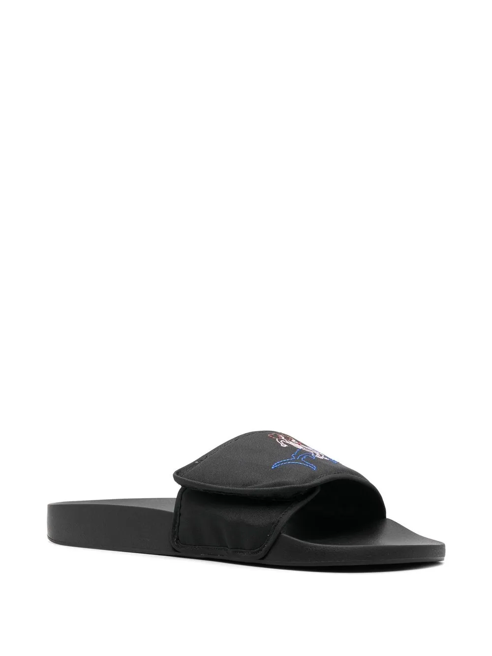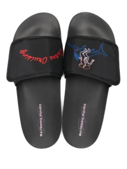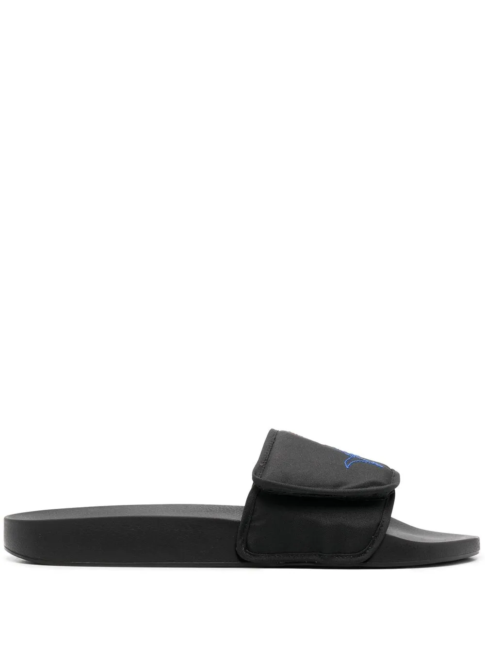 embroidered flat pool slides from CARNE BOLLENTE featuring black, fabric strap, open toe, round toe and slip-on style. POSITIVELY CONSCIOUS: This Planet Conscious product is crafted from certified recycled or upcycled materials, which helps you make a better choice for the environment as they generate less energy, save water and reduce the need for new raw materials. For recycled synthetic clothing products we highly recommend using a microfibre-catching washing bag to ensure that no microplastics that can pollute water are released in the process..