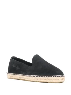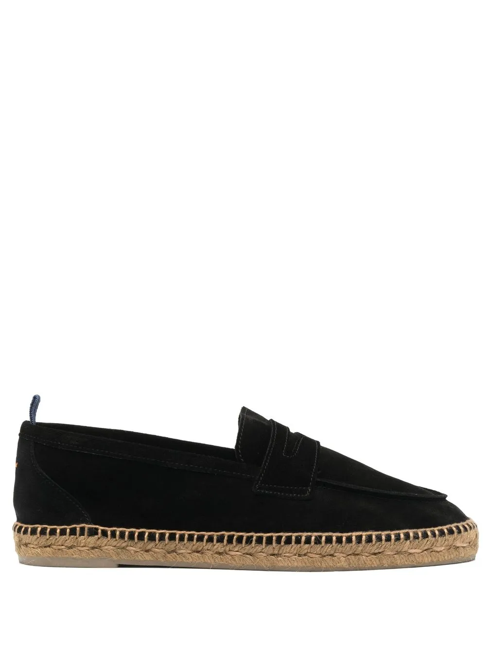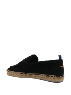 Nacho penny loafer espadrilles from CastaƱer featuring black, calf suede, calf leather, almond toe, penny slot and jute sole.