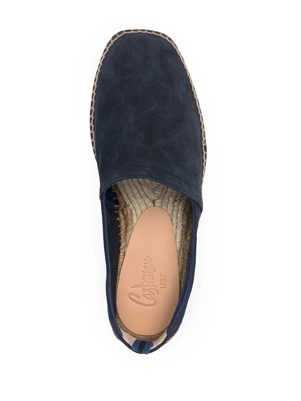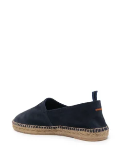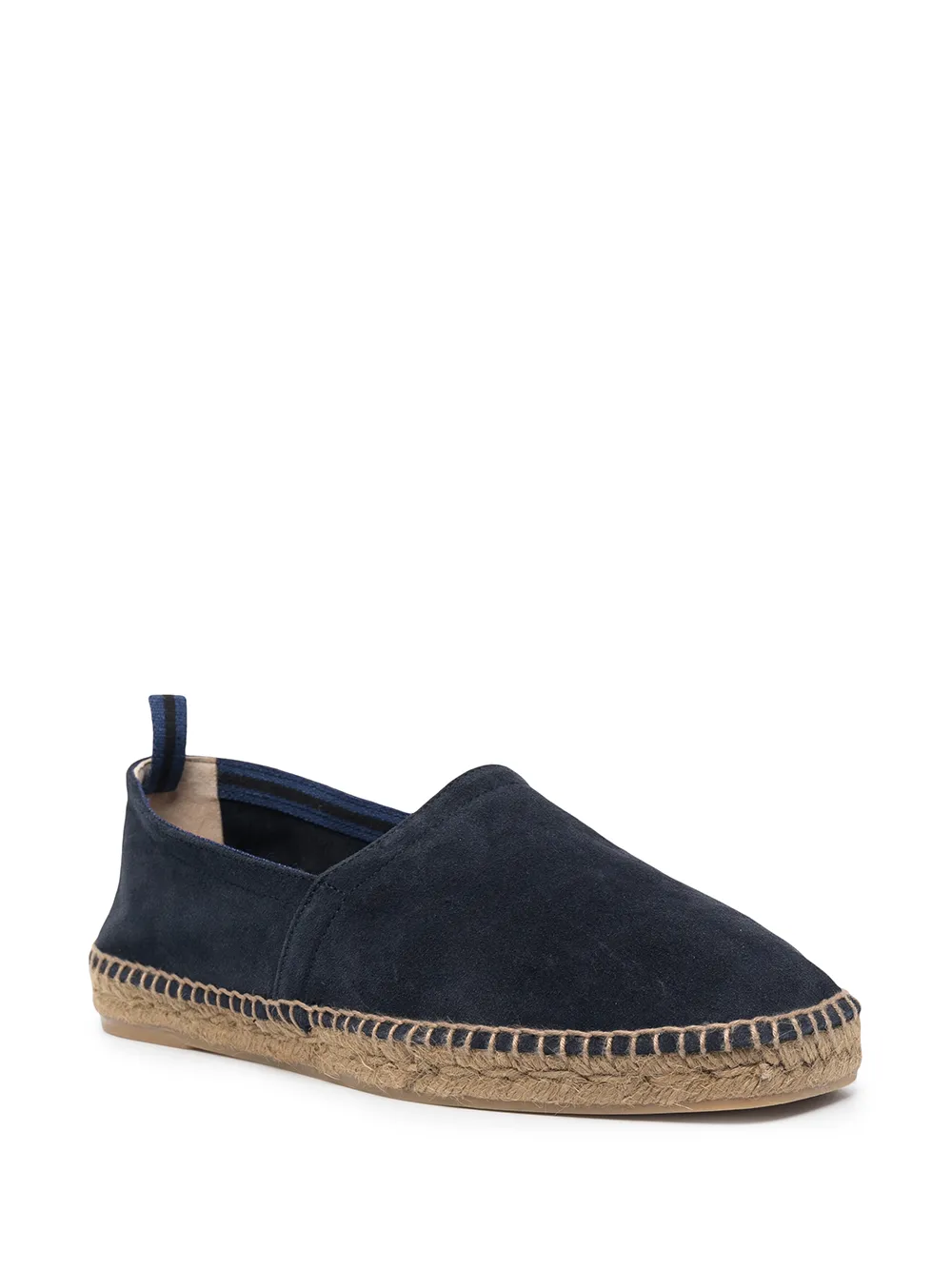 Dark blue suede/leather/raffia Pablo suede espadrilles from CASTAĆER featuring slip-on style, contrast stitching, stripe detailing, almond toe, pull-tab at the heel, branded leather insole and braided raffia sole.