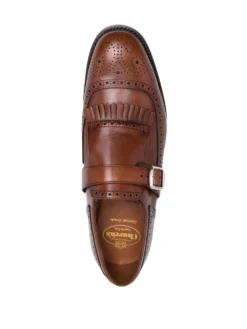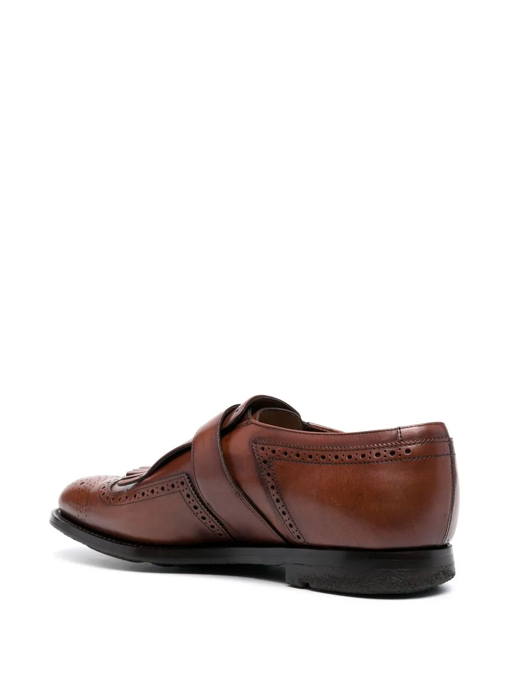 Shanghai leather monk shoes from CHURCH’S featuring calf leather, perforated detailing, fringe detailing, monk strap, round toe, branded insole, flat rubber sole and burnt brown.
