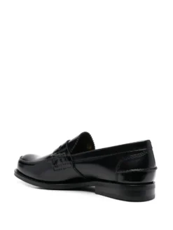 Black Tundbridge leather loafers from Church’s featuring a slip-on style, a brand embossed insole, an almond toe, a flat leather sole and a sawtooth trim.