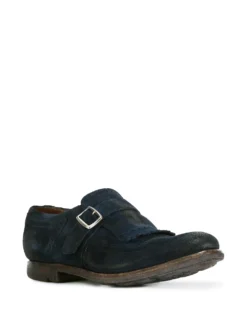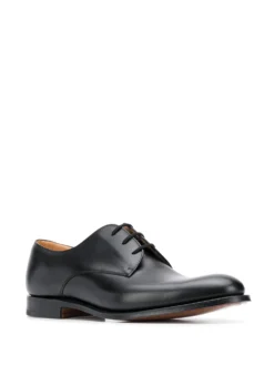 Black Tundbridge leather loafers from Church’s featuring a slip-on style, a brand embossed insole, an almond toe, a flat leather sole and a sawtooth trim.