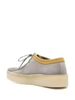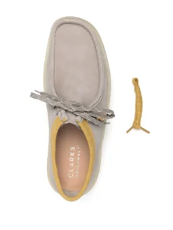 lace-up suede derby shoes from Clarks Originals featuring stone, calf suede, round toe, front lace-up fastening, branded leather insole and flat rubber sole.
