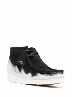 Black leather penny-slot loafers from Clarks Originals featuring penny slot, zigzag edge, slip-on style, round toe and low block heel.