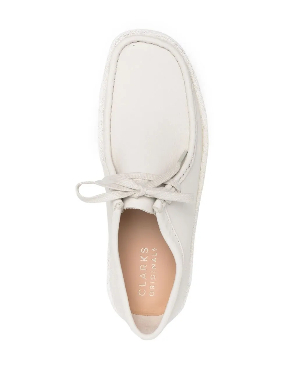 Bright white leather Wallabee lace-up leather shoes from Clarks Originals featuring square toe, front lace-up fastening, branded insole and rubber sole.
