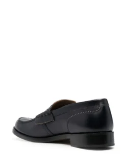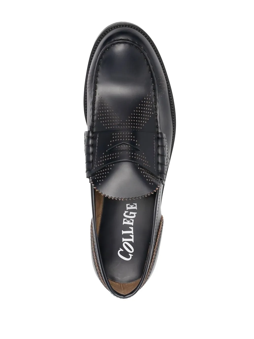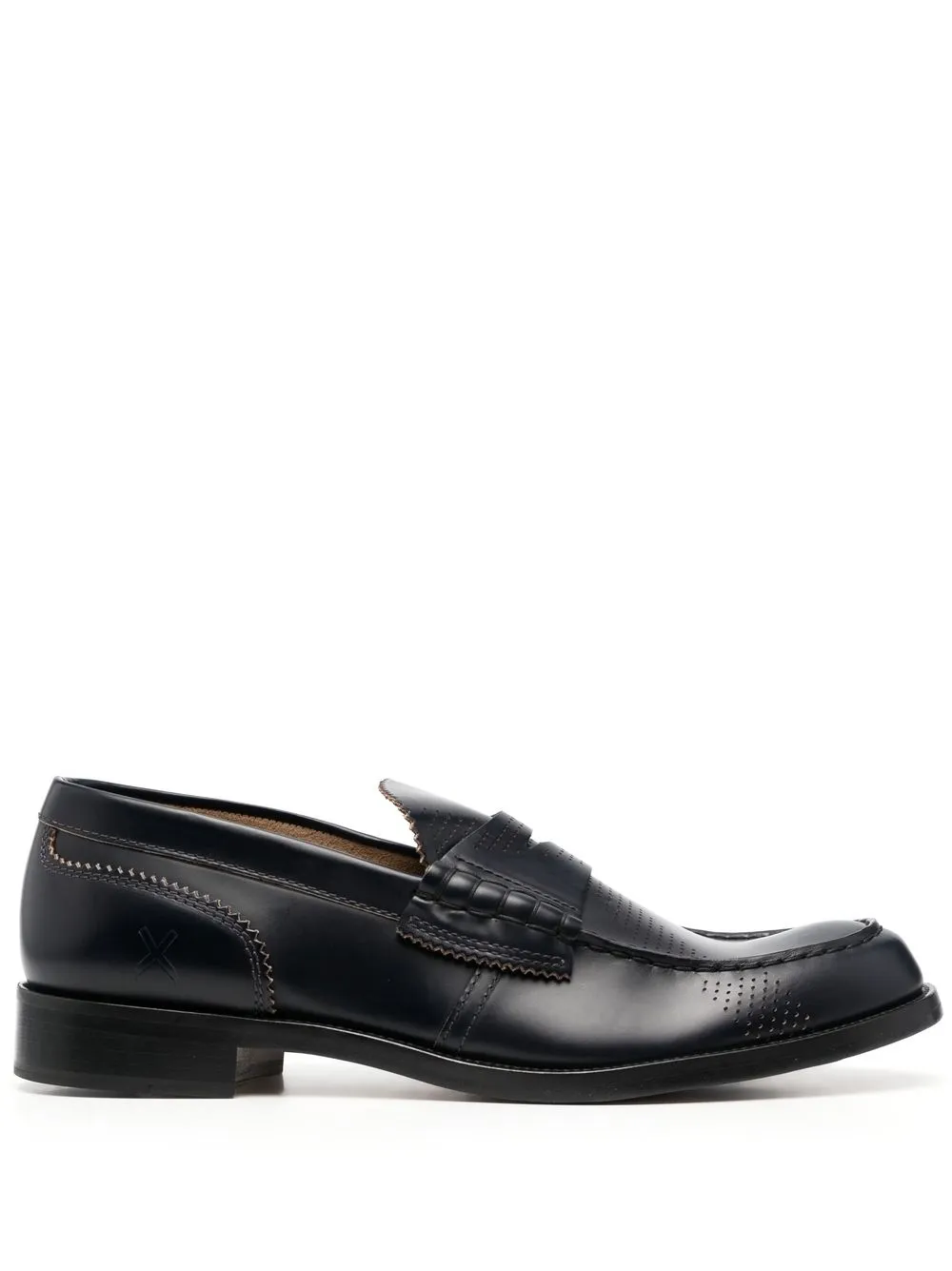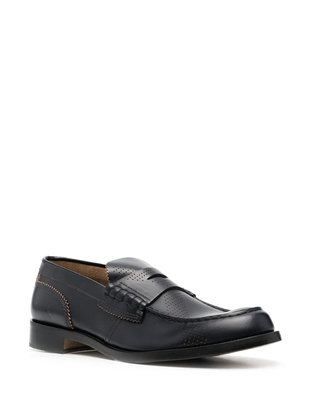 texture-detail leather loafers from college featuring prussian blue, calf leather, punched holes, decorative stitching, tassel detail, almond toe, branded insole and stacked sole.