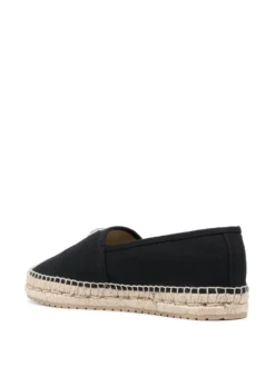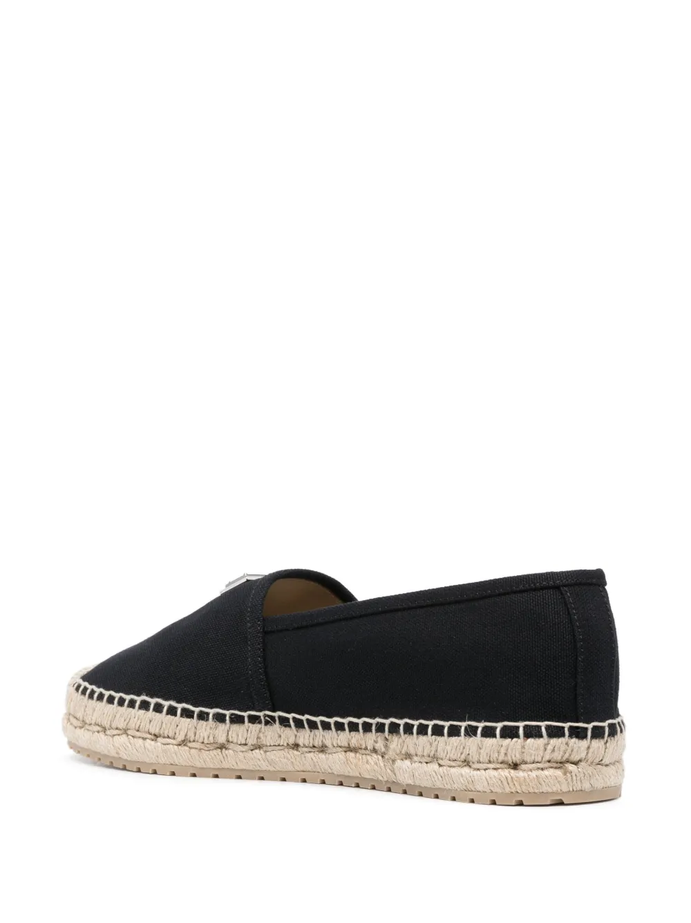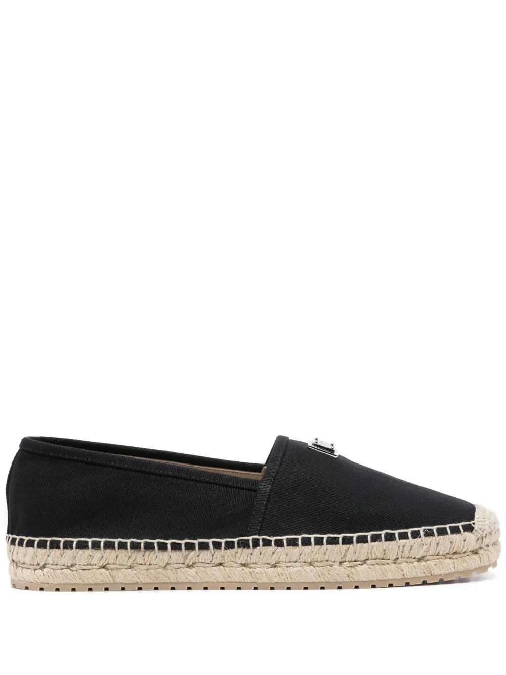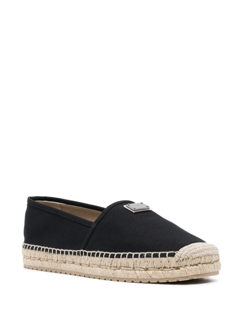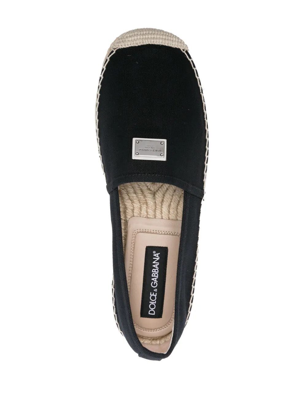 logo-patch espadrilles from DOLCE & GABBANA featuring black, raffia, silver-tone logo plaque, branded insole, round toe, braided raffia sole and slip-on style.