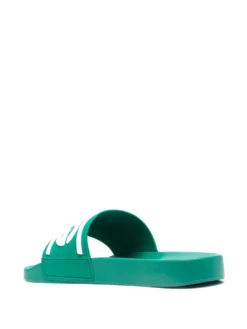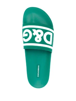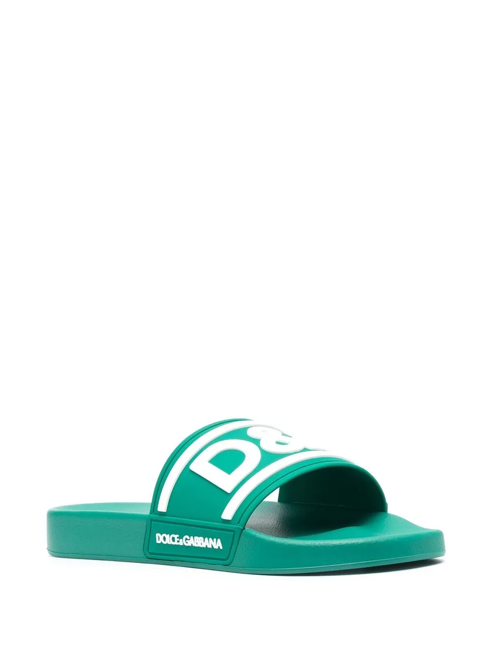 logo-print beach sliders from DOLCE & GABBANA featuring slip-on style, logo print to the front, logo print to the side, open toe, flat rubber sole and sea green/white.