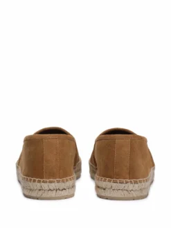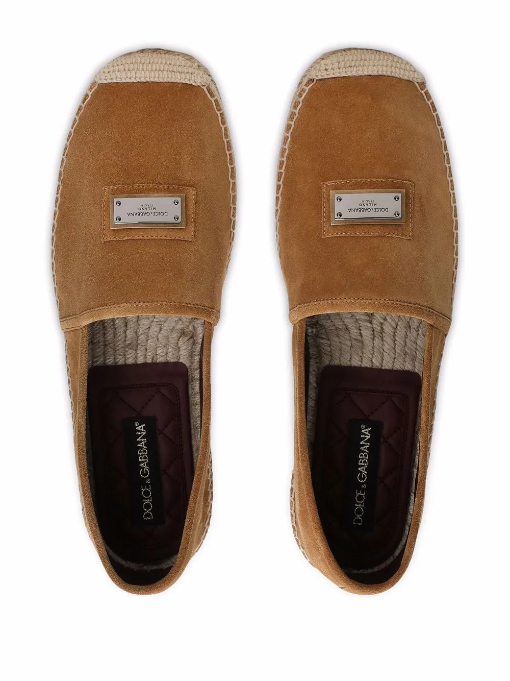 Warm brown leather/suede suede logo-plaque espadrilles from DOLCE & GABBANA featuring logo plaque, round toe, branded insole and braided raffia sole.