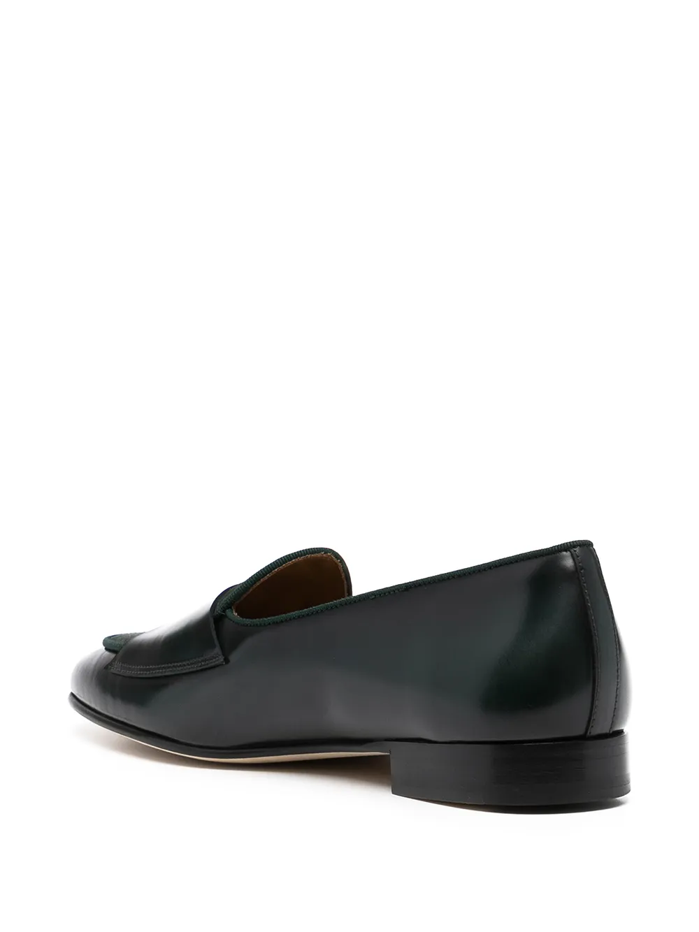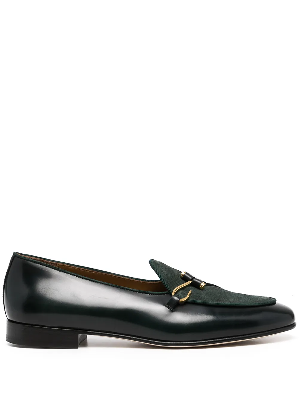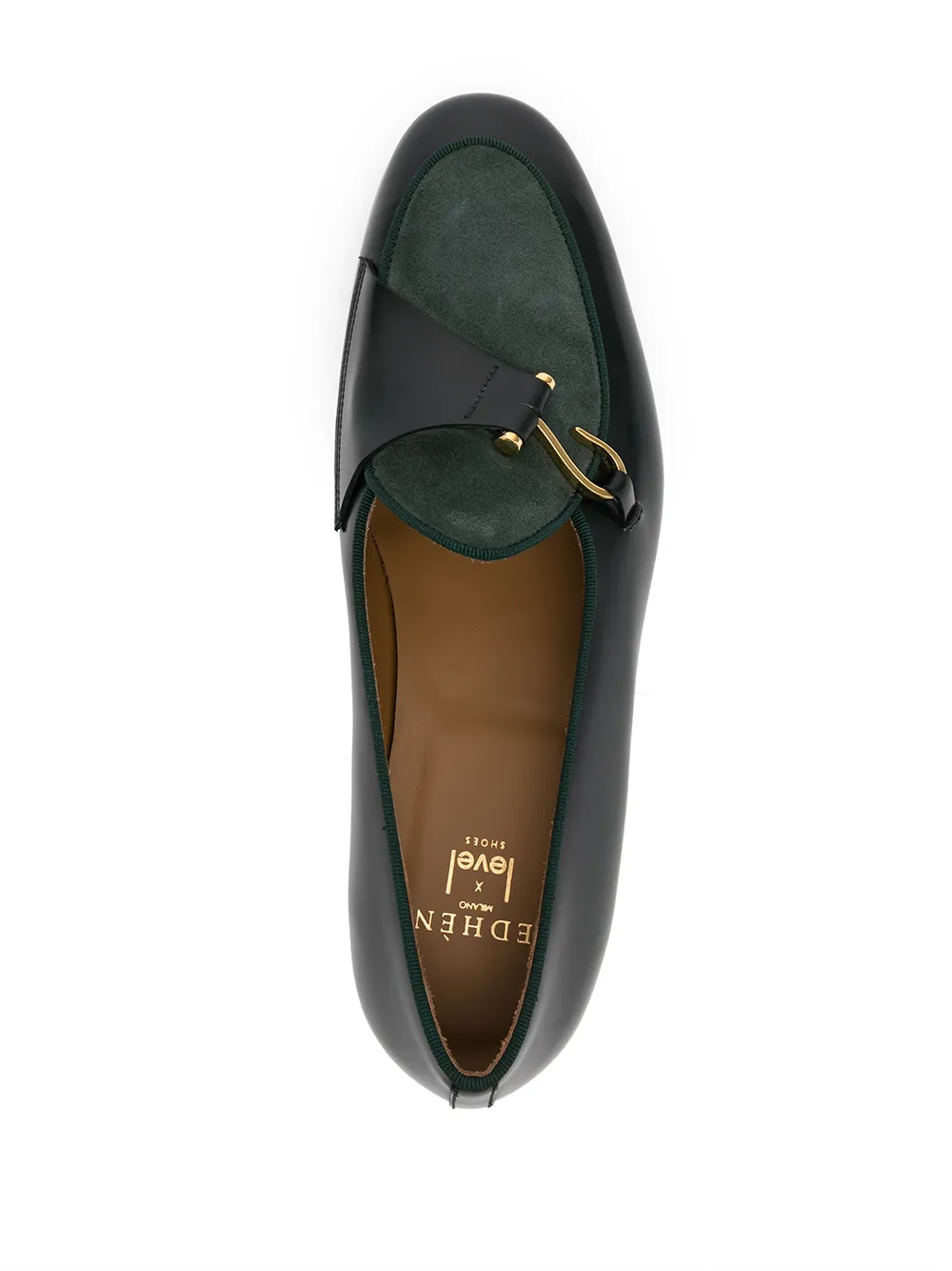 Deep green calf leathers Comporta single buckle loafers from Edhen Milano featuring gold-tone hardware, almond toe, slip-on style, branded leather insole and flat leather sole.