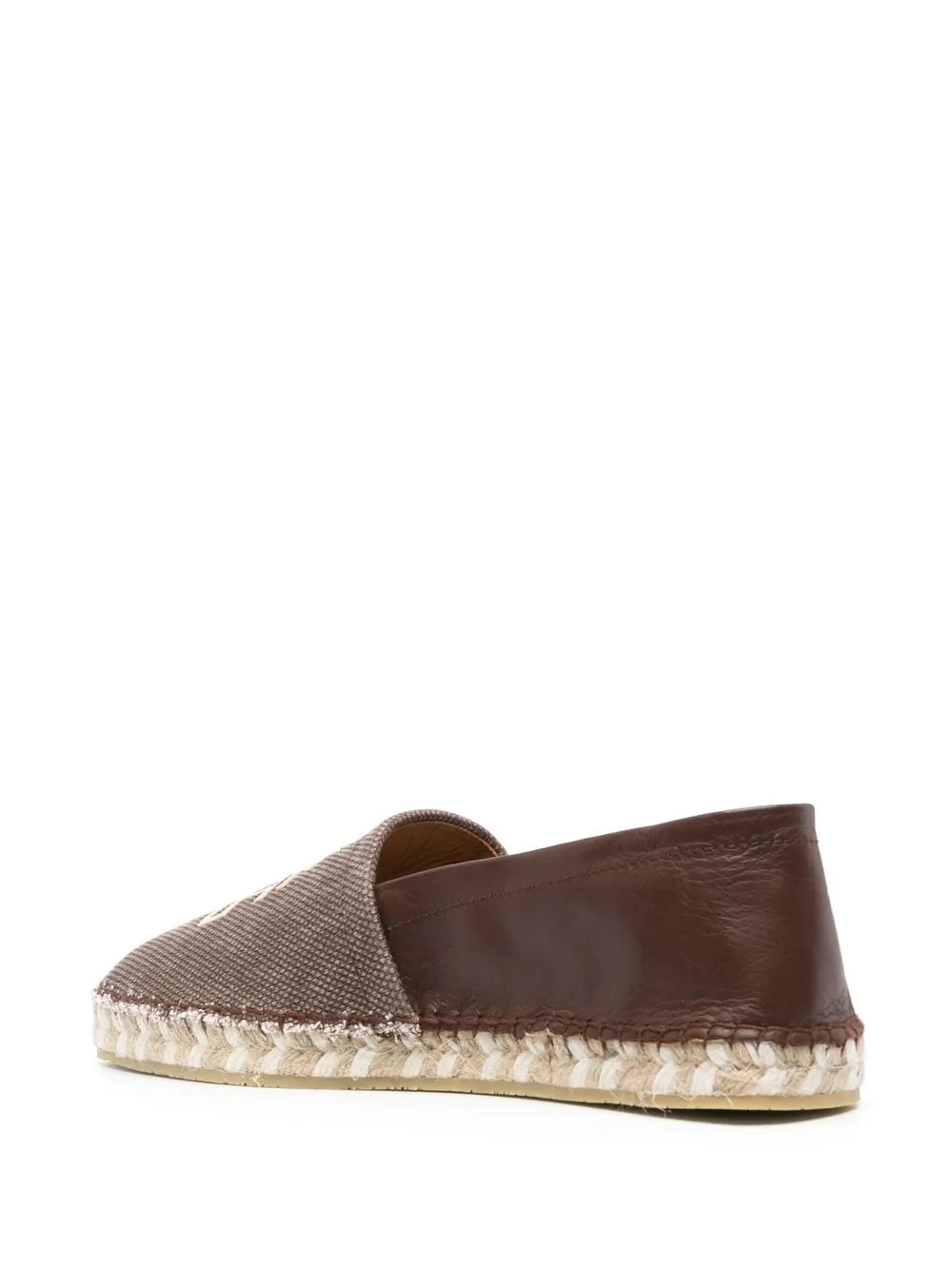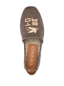 logo-print slip-on espadrilles from ETRO featuring light brown, calf leather, logo print to the front, round toe, braided raffia sole and slip-on style.