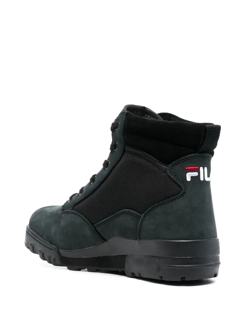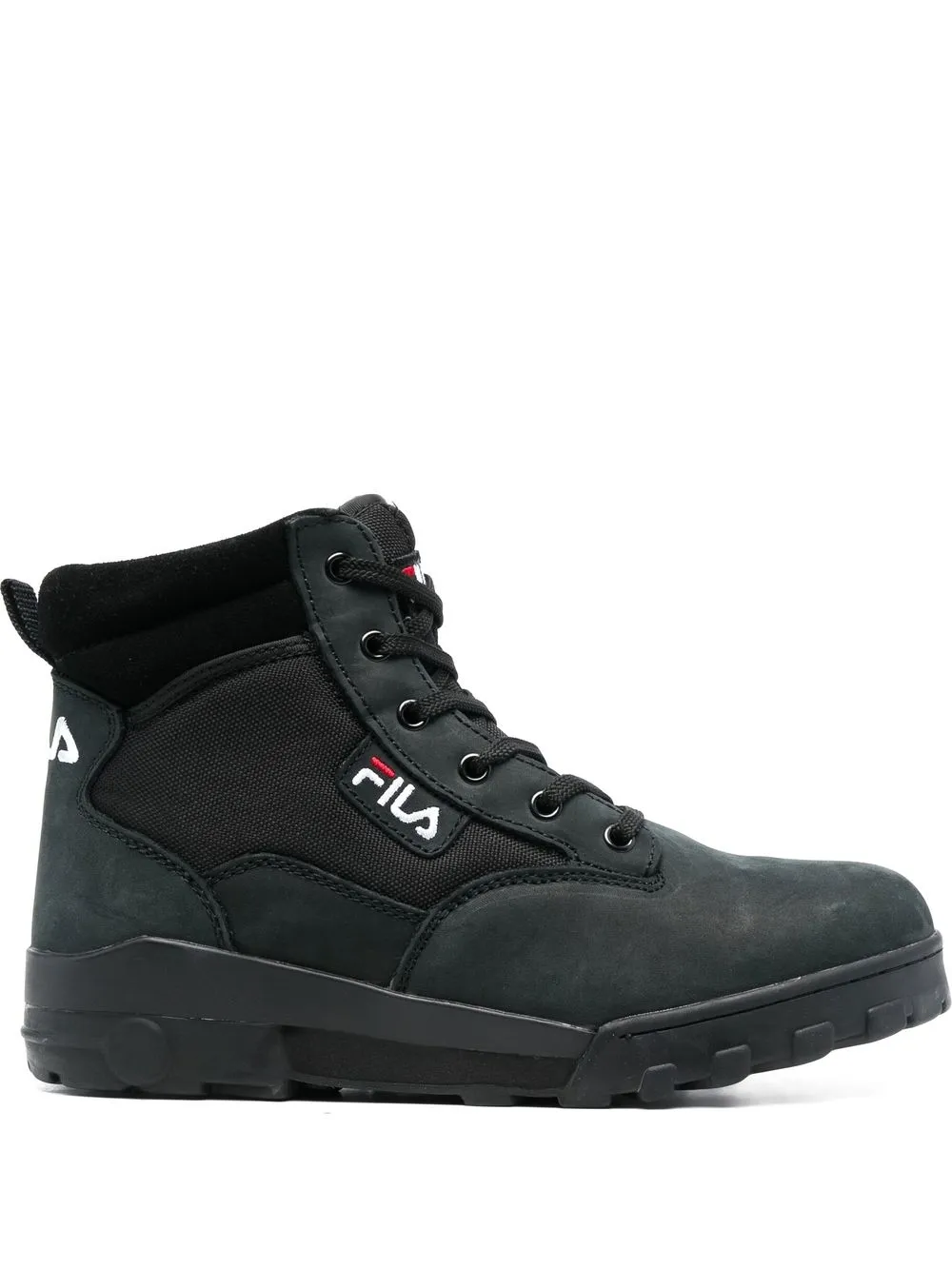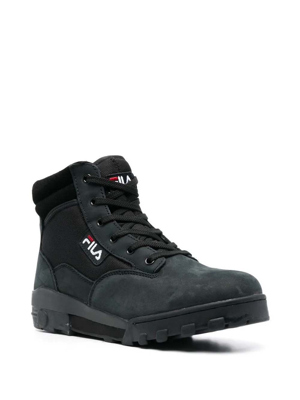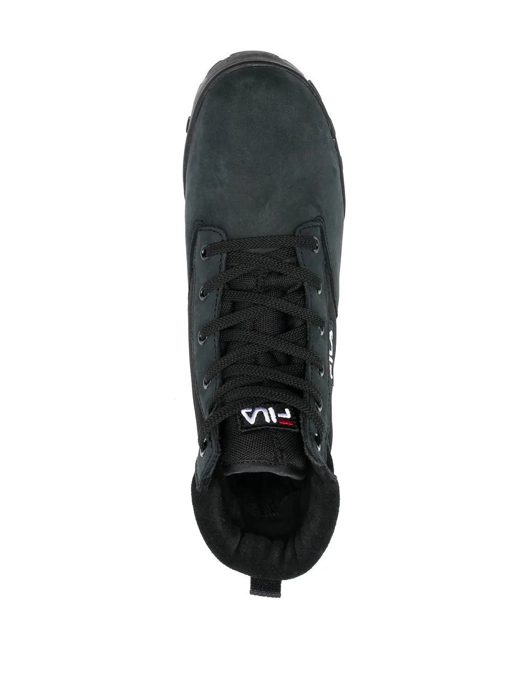 Grunge II lace-up boots from FILA featuring jet black, calf leather, embroidered logo, logo patch at the tongue, front lace-up fastening, round toe and chunky rubber sole.