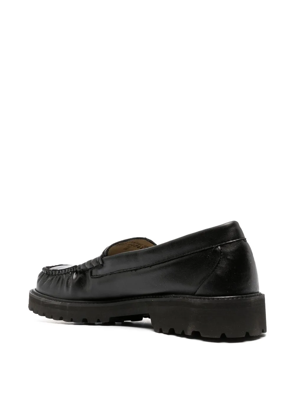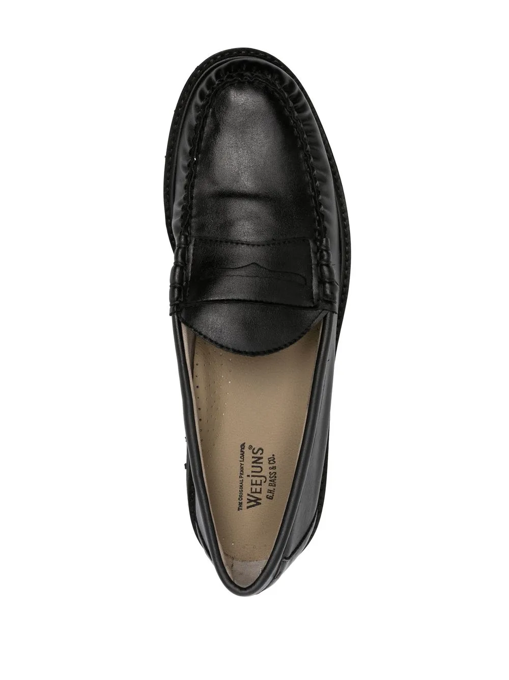 Larson leather loafers from G.H. Bass & Co. featuring black, branded insole, round toe, slip-on style, ridged rubber sole and low heel.