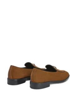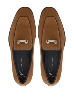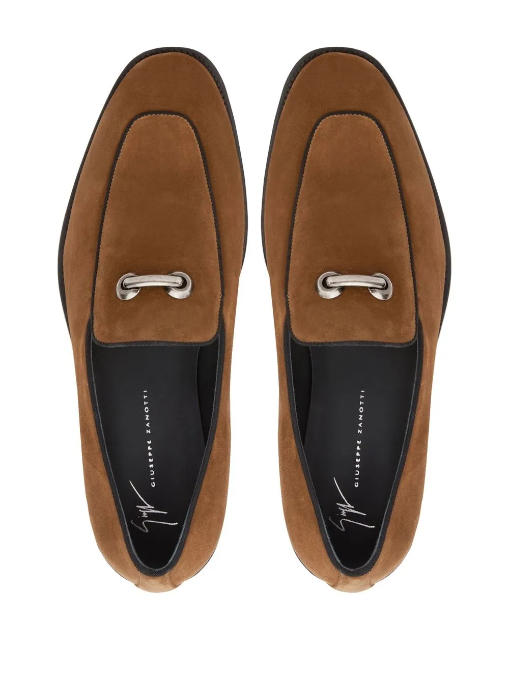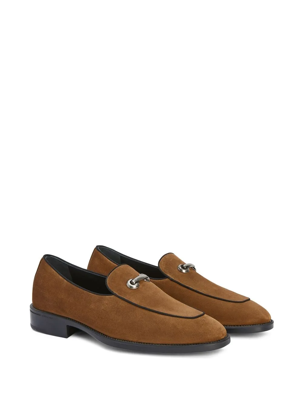 Archibald suede loafers from Giuseppe Zanotti featuring chestnut brown, suede, almond toe, slip-on style and stacked sole.