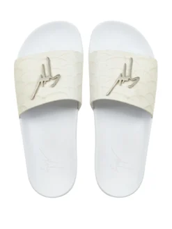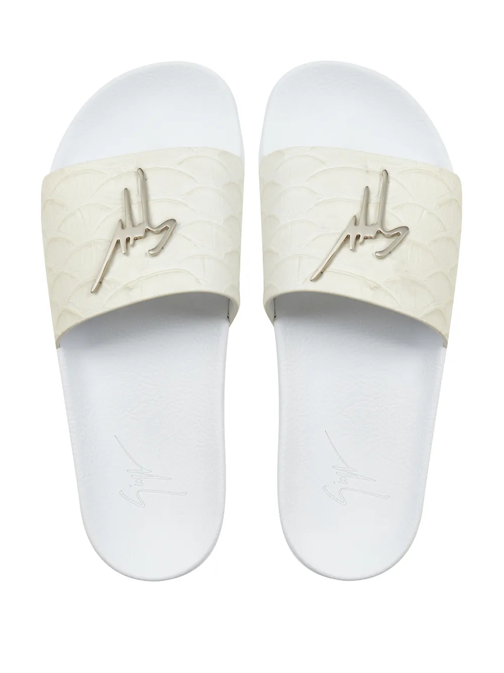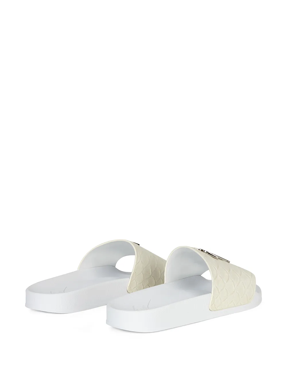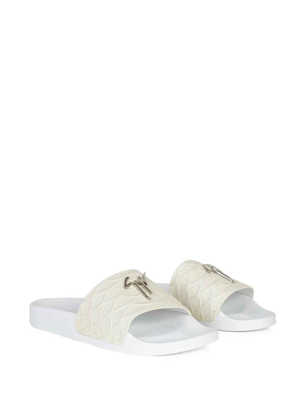 White leather Brett koi-print leather sliders from Giuseppe Zanotti featuring silver-tone logo lettering, open toe, slip-on style, flat rubber sole and koi-print.