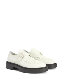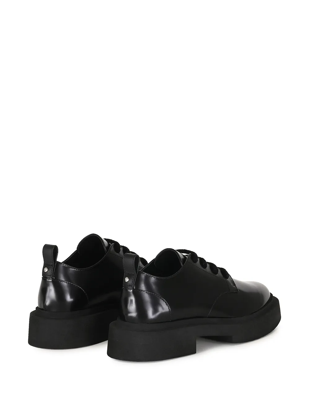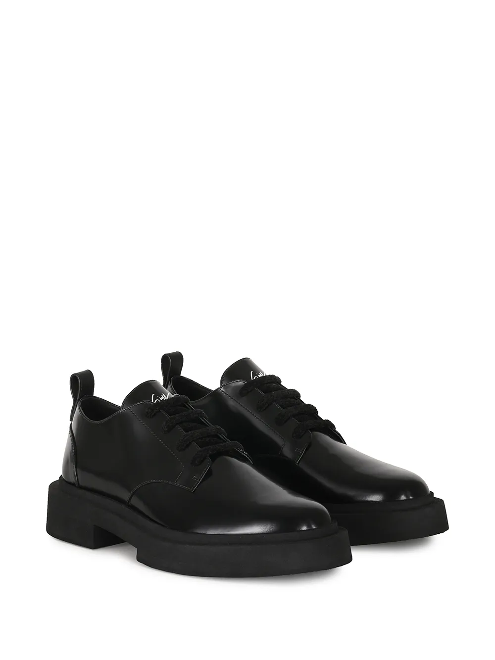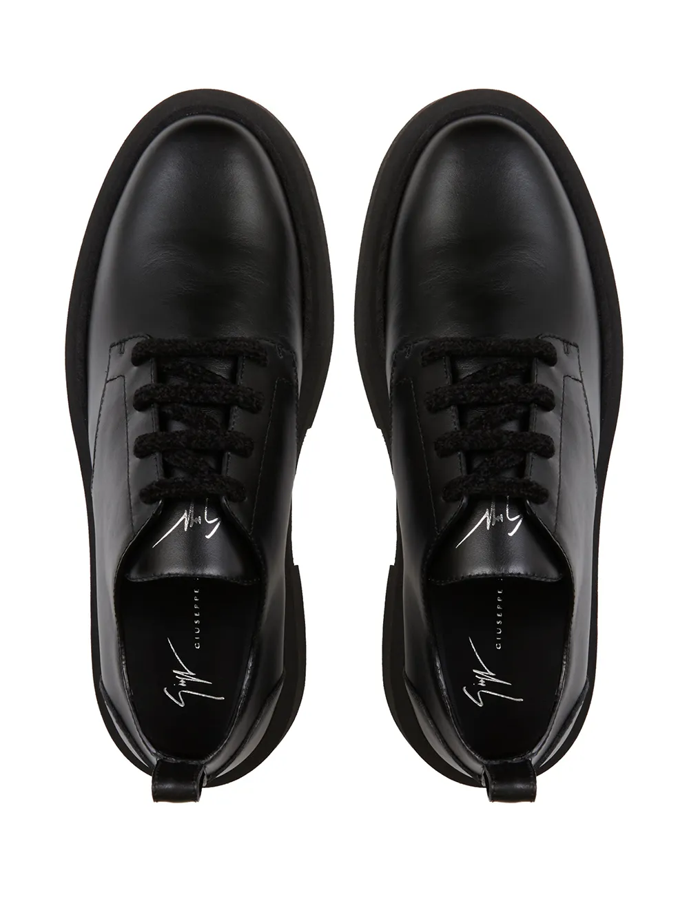 Black bovine leather chunky sole Derby shoes from Giuseppe Zanotti featuring round toe, front lace-up fastening, logo pull-tab at the heel, branded insole and chunky rubber sole.