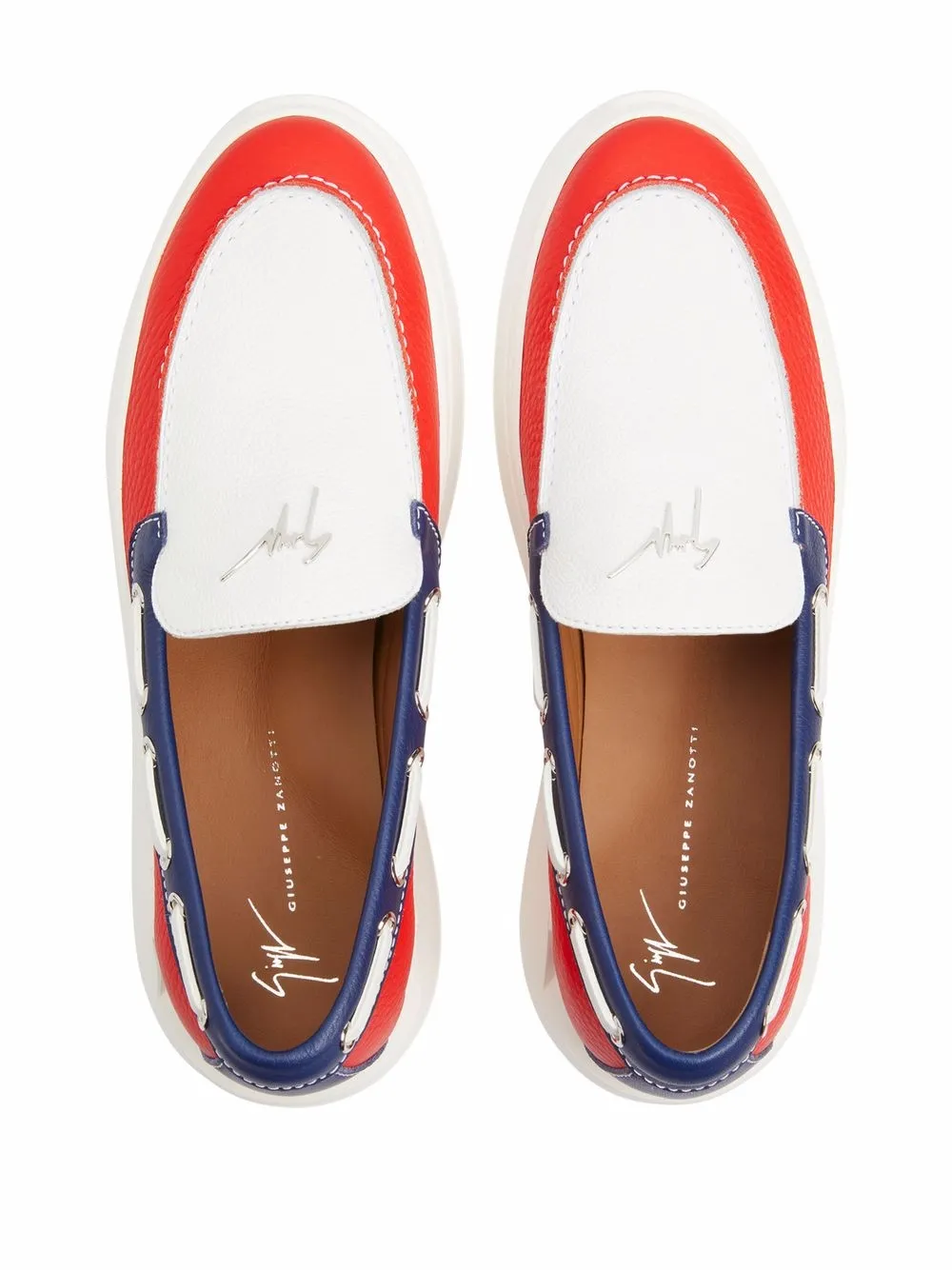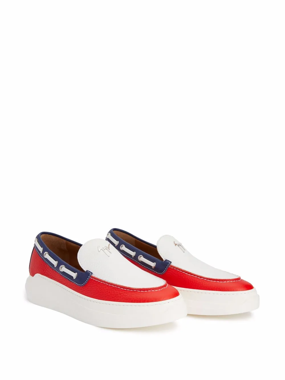 White/red/blue leather Conley colour-block loafers from Giuseppe Zanotti featuring colour-block design, almond toe, logo lettering, flat rubber sole and branded leather insole.