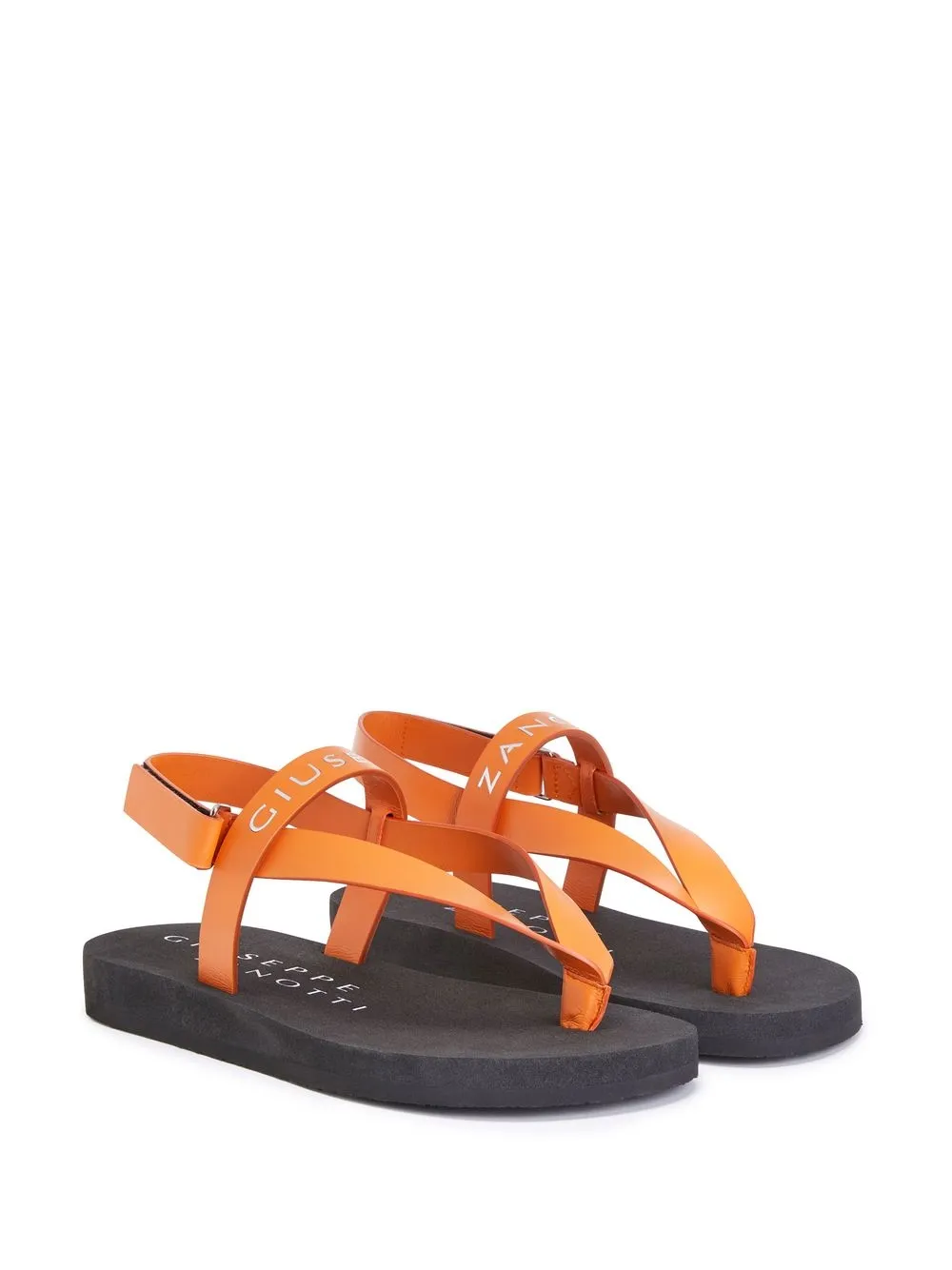 Khais logo-strap flip flops from Giuseppe Zanotti featuring orange, black/white, leather, logo-print strap, thong strap, slingback strap, open toe, branded footbed and flat rubber sole.