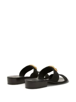 logo-plaque leather slides from Giuseppe Zanotti featuring black, calf leather, cotton, logo plaque, branded insole, open toe, slip-on style and low heel.