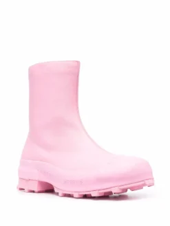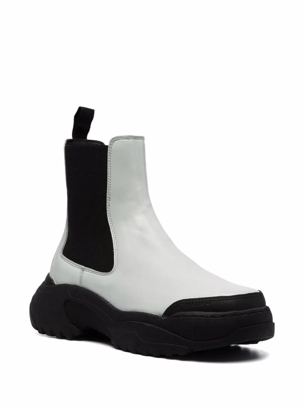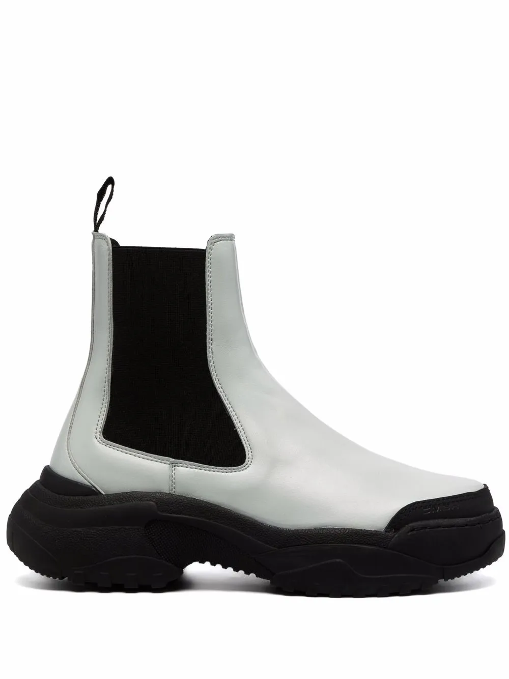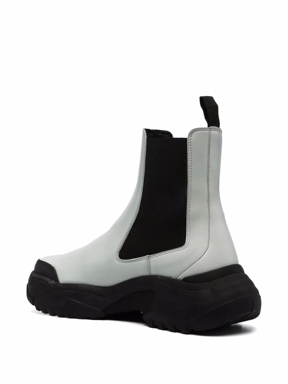 Grey faux leather chelsea ankle boots from GmbH featuring matte finish, round toe, elasticated side panels, pull-tab at the heel, branded insole and ridged rubber sole.