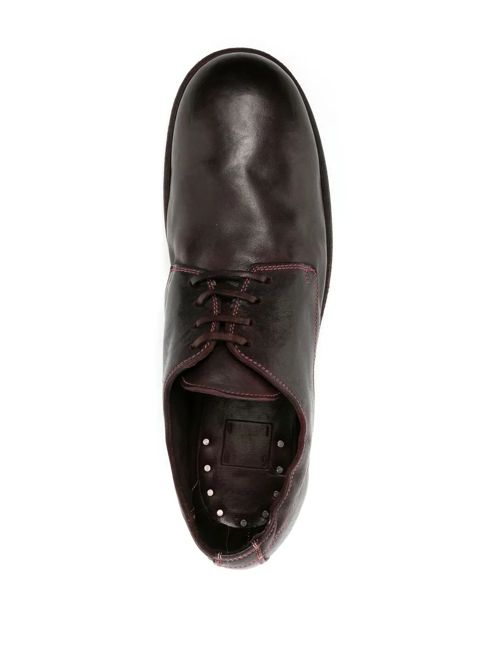 lace-up leather shoes from GUIDI featuring red, leather, contrast stitching, front lace-up fastening, round toe, flat leather sole and branded insole.