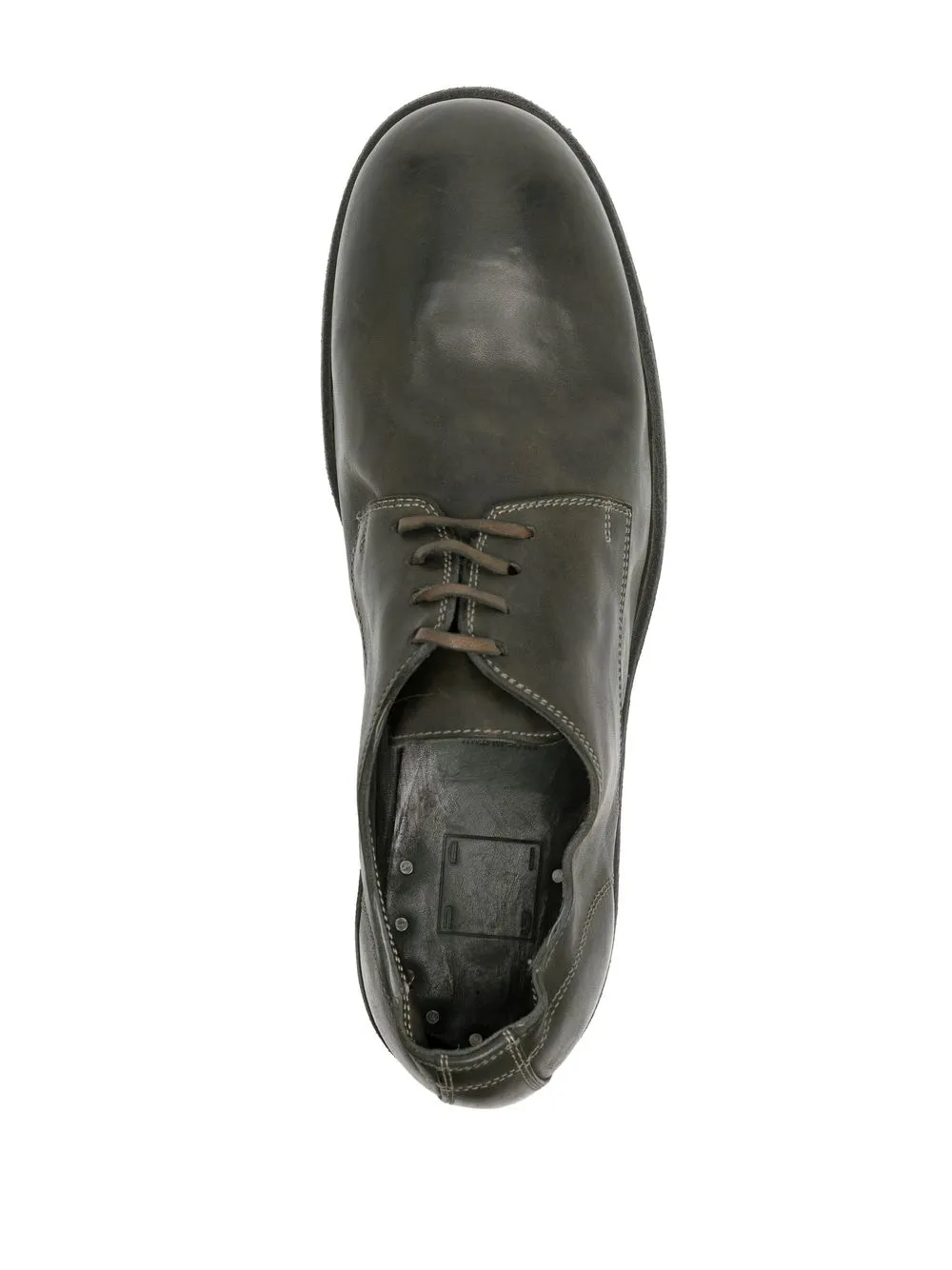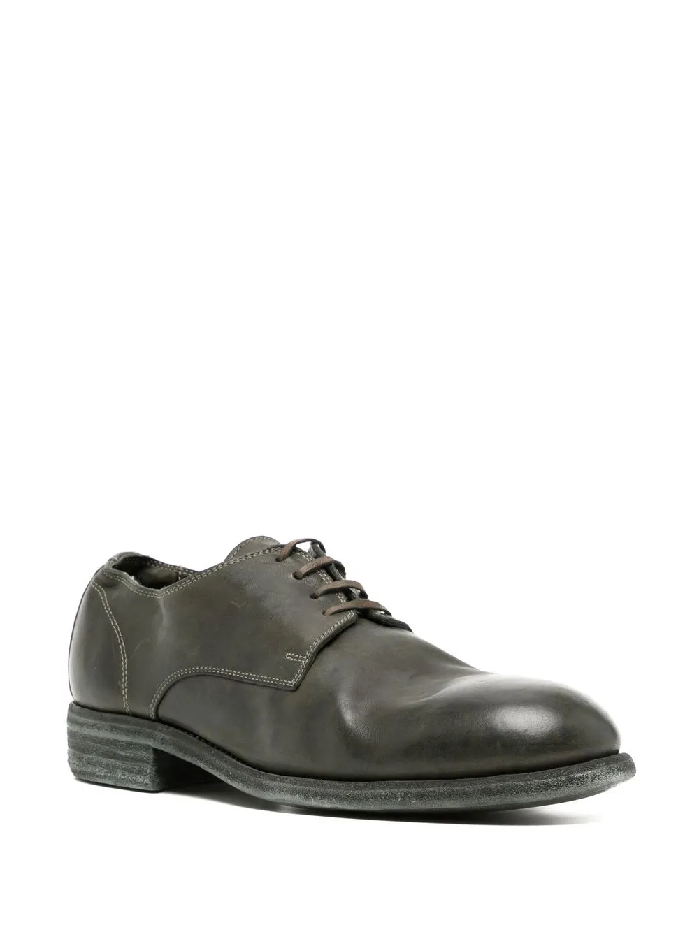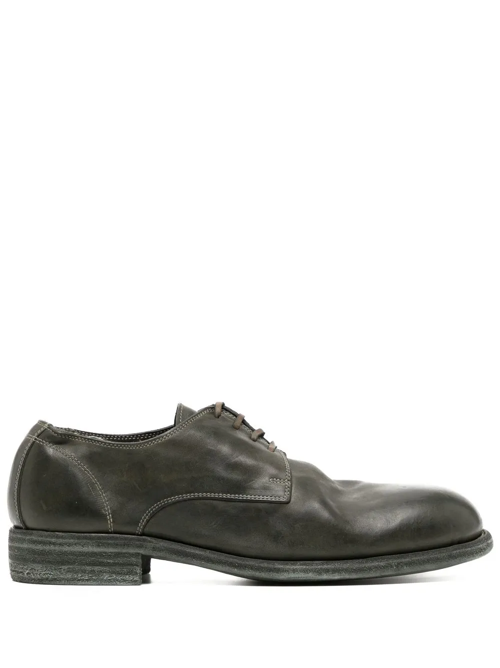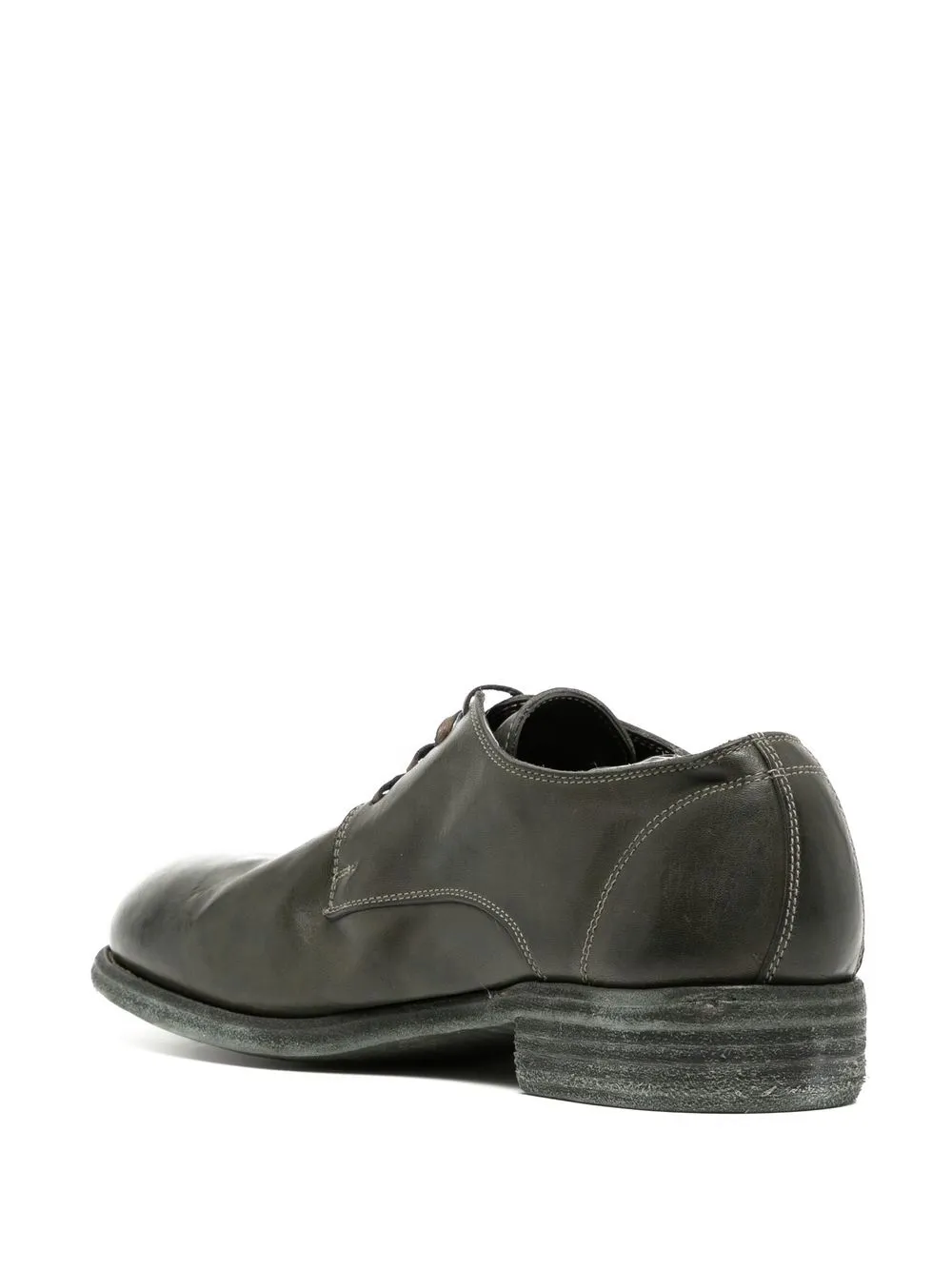 round toe derby shoes from GUIDI featuring front lace-up fastening, round toe, flat sole, branded insole, green and calf leather.