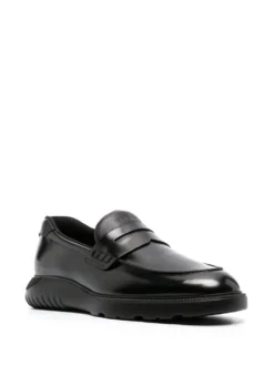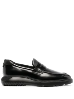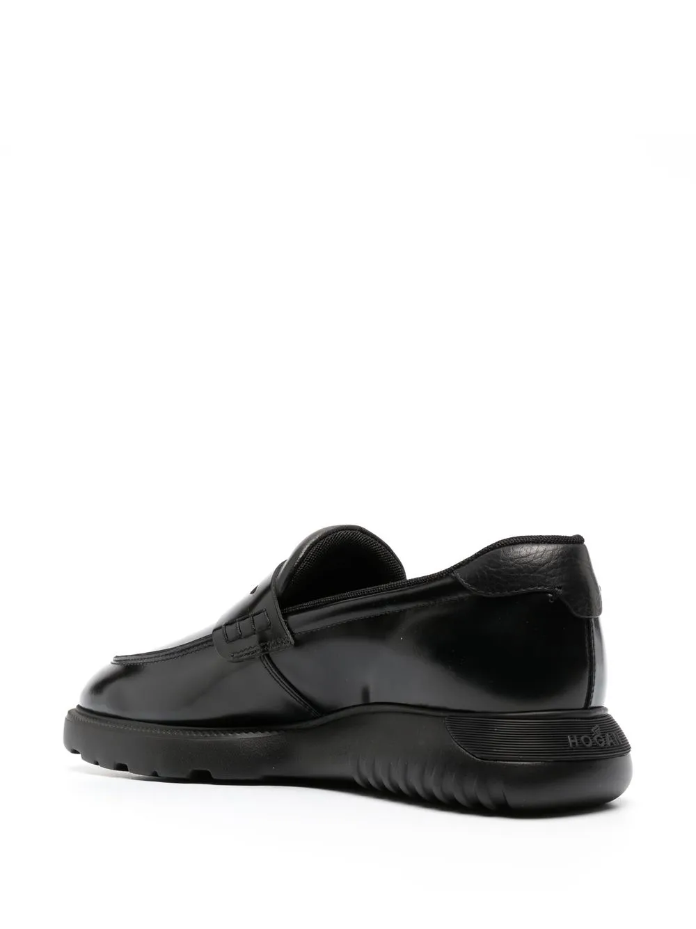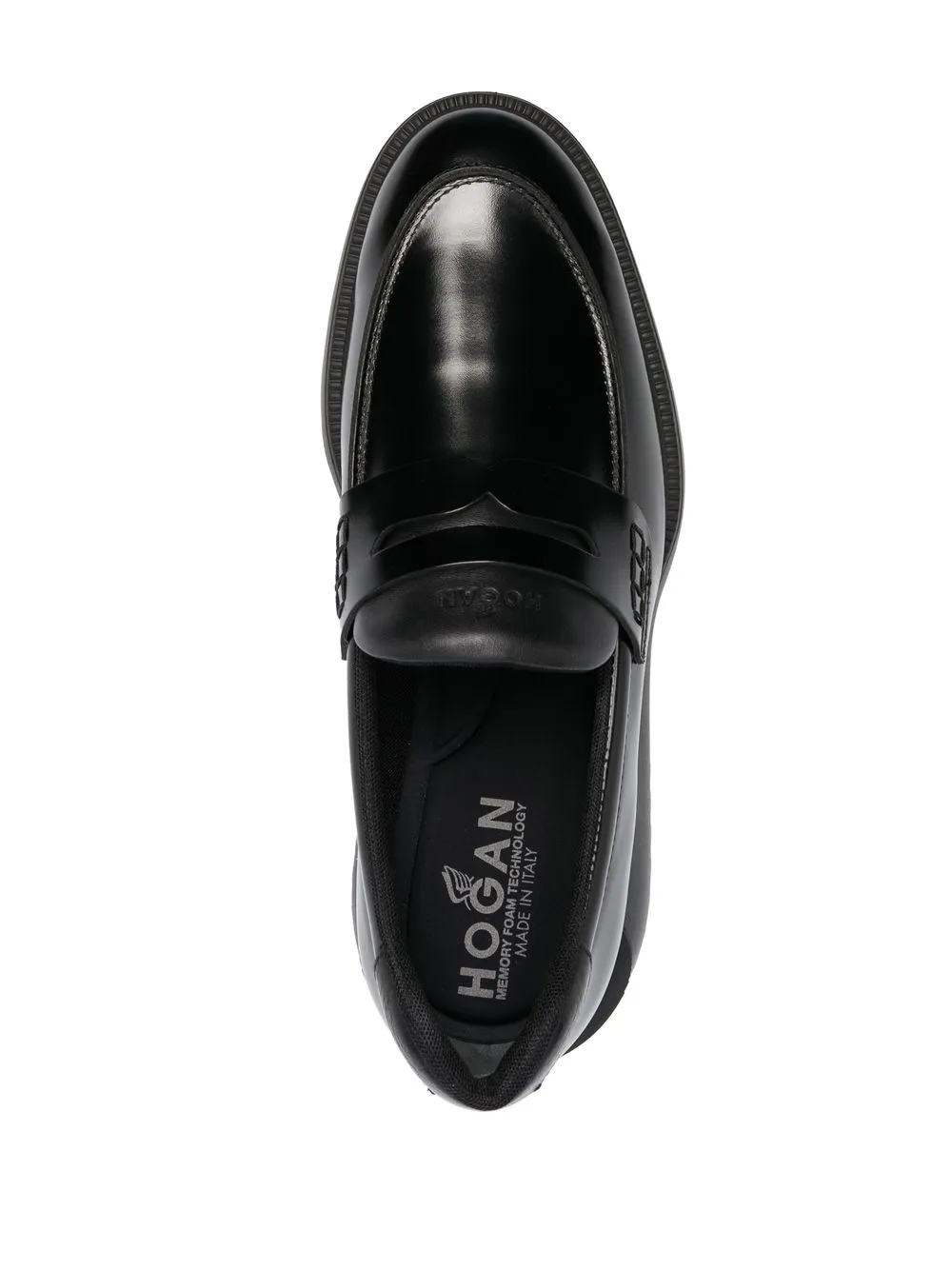 H600 debossed-logo penny loafers from HOGAN featuring black, calf leather, penny slot, logo-debossed tongue, round toe, branded insole, memory foam insole and chunky rubber sole.