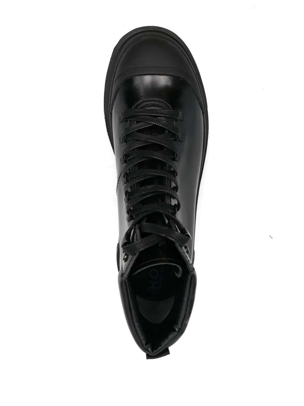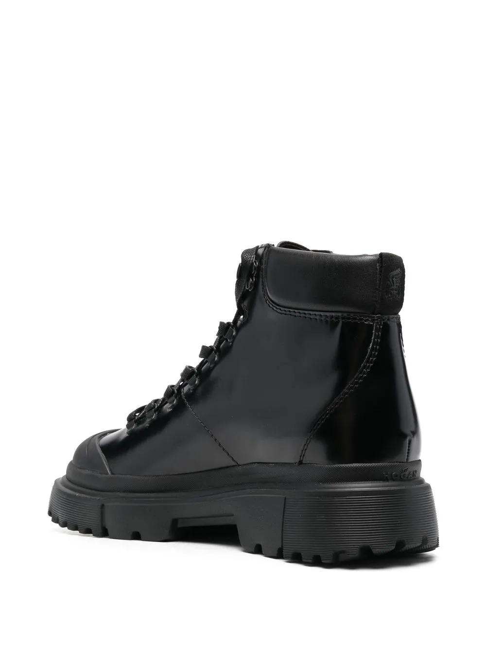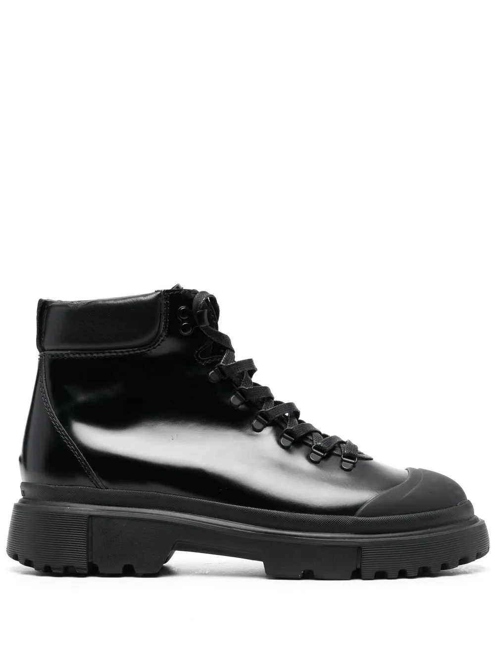 lace-up leather ankle boots from HOGAN featuring black, calf leather, polished effect, contrasting toecap, round toe, front lace-up fastening, logo-embossed tongue, ankle-length, ridged rubber sole and low block heel.