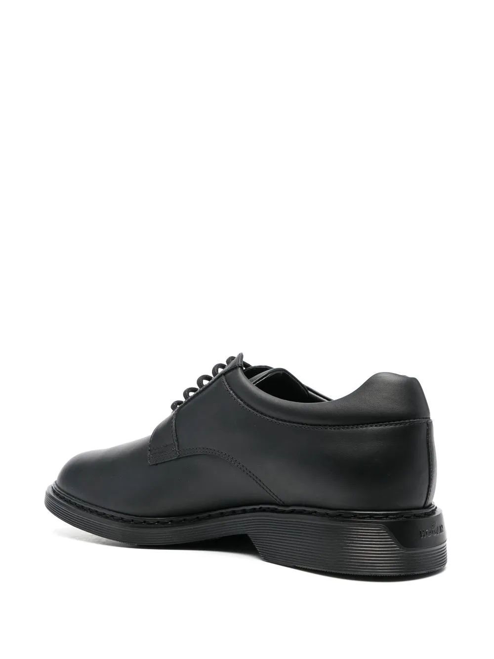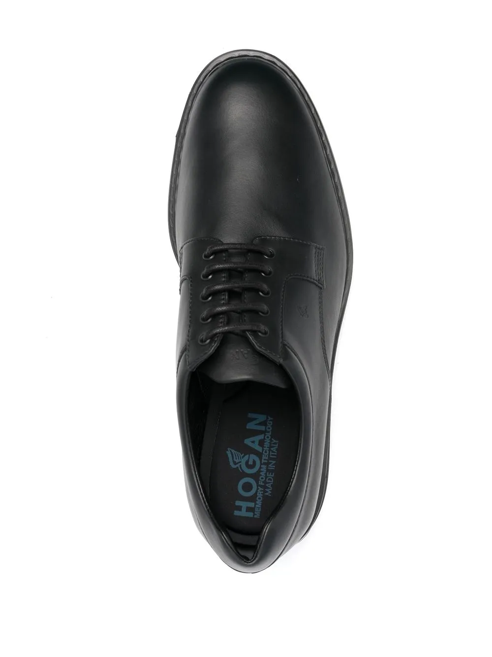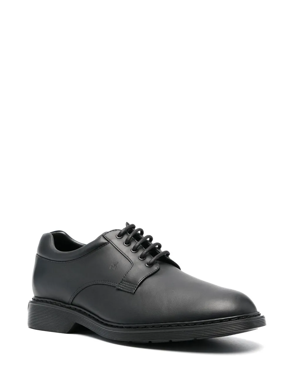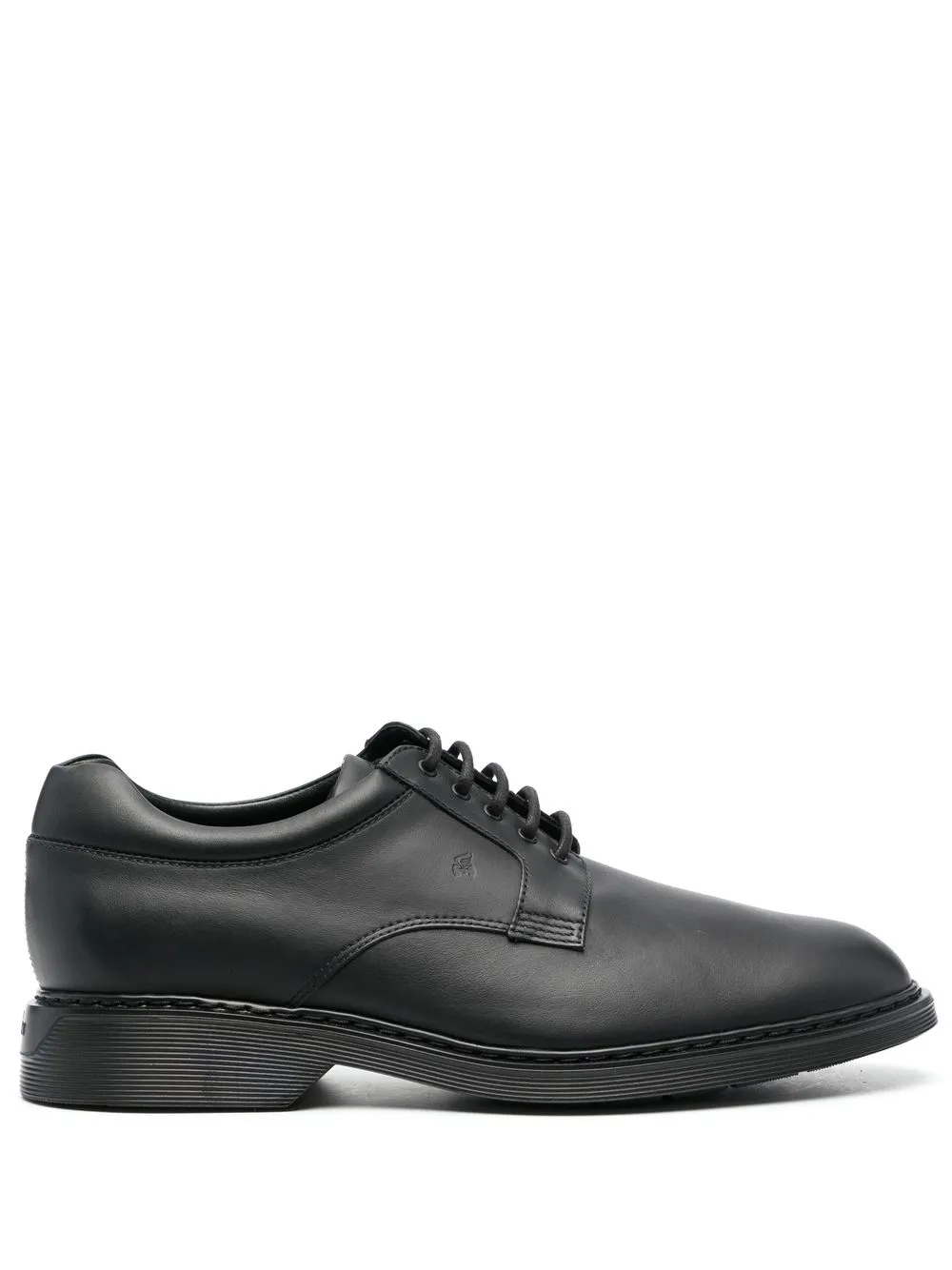 lace-up leather Derby shoes from HOGAN featuring black, calf leather, debossed logo to the side, almond toe, front lace-up fastening, padded ankle and low block heel.
