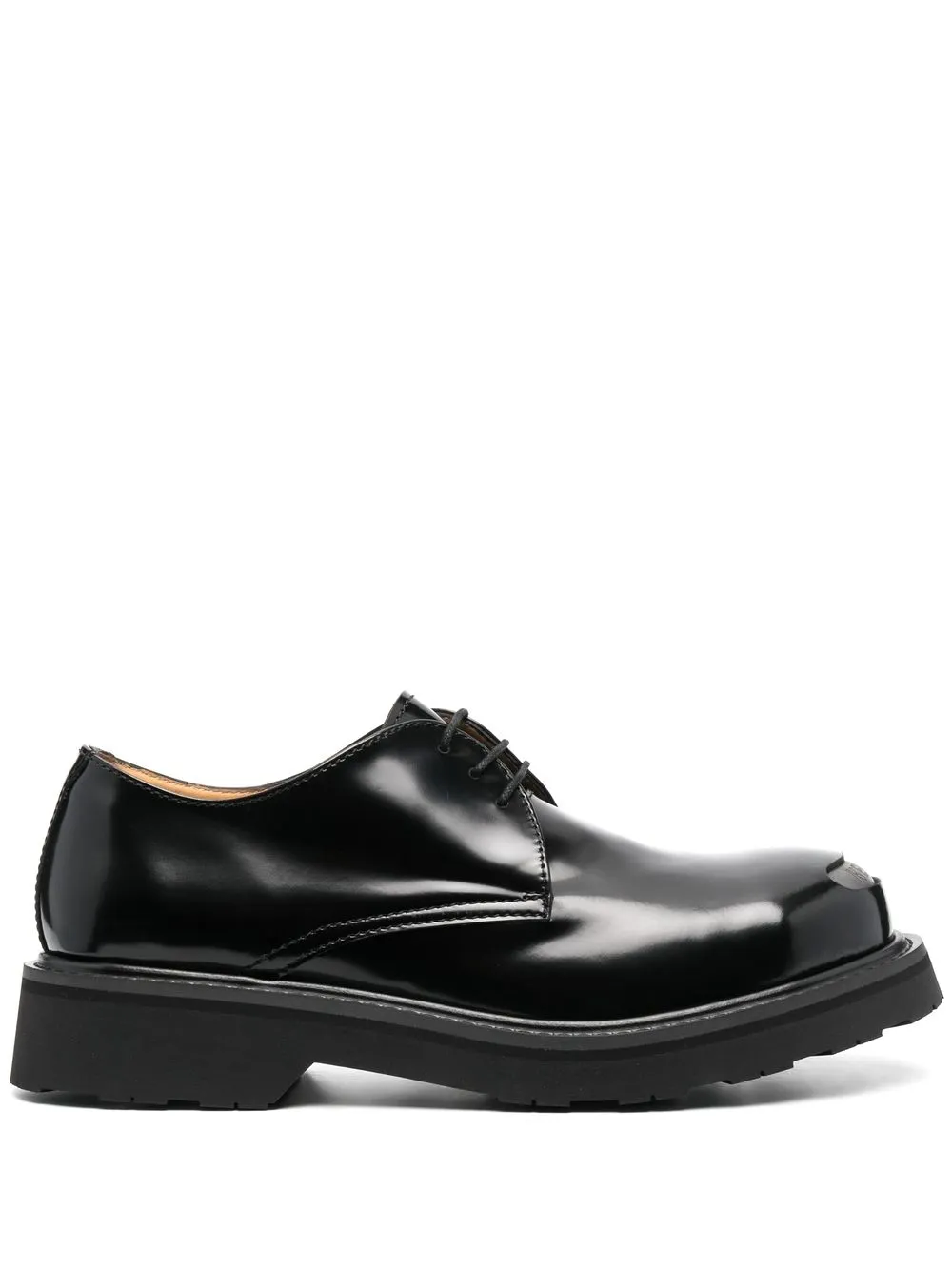 Kenzosmile leather derby shoes from KENZO featuring black, calf leather, cut-out detailing, logo print to the front, round toe, front lace-up fastening, chunky rubber sole, low stacked heel, tonal stitching and branded insole.