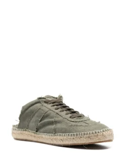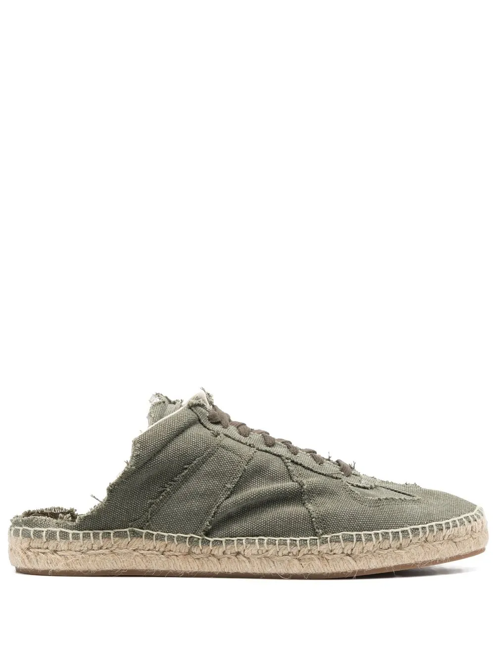 Olive green backless espadrille sneakers from Maison Margiela featuring front lace-up fastening, braided raffia sole, rubber sole, contrast stitching, frayed edge, backless and slip-on style.