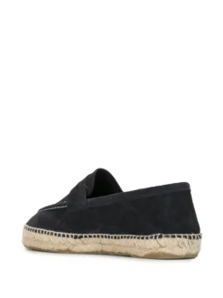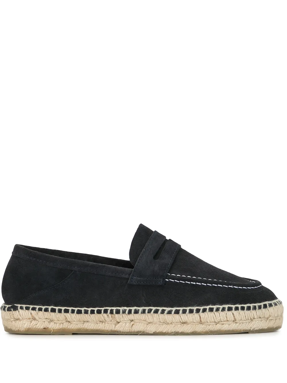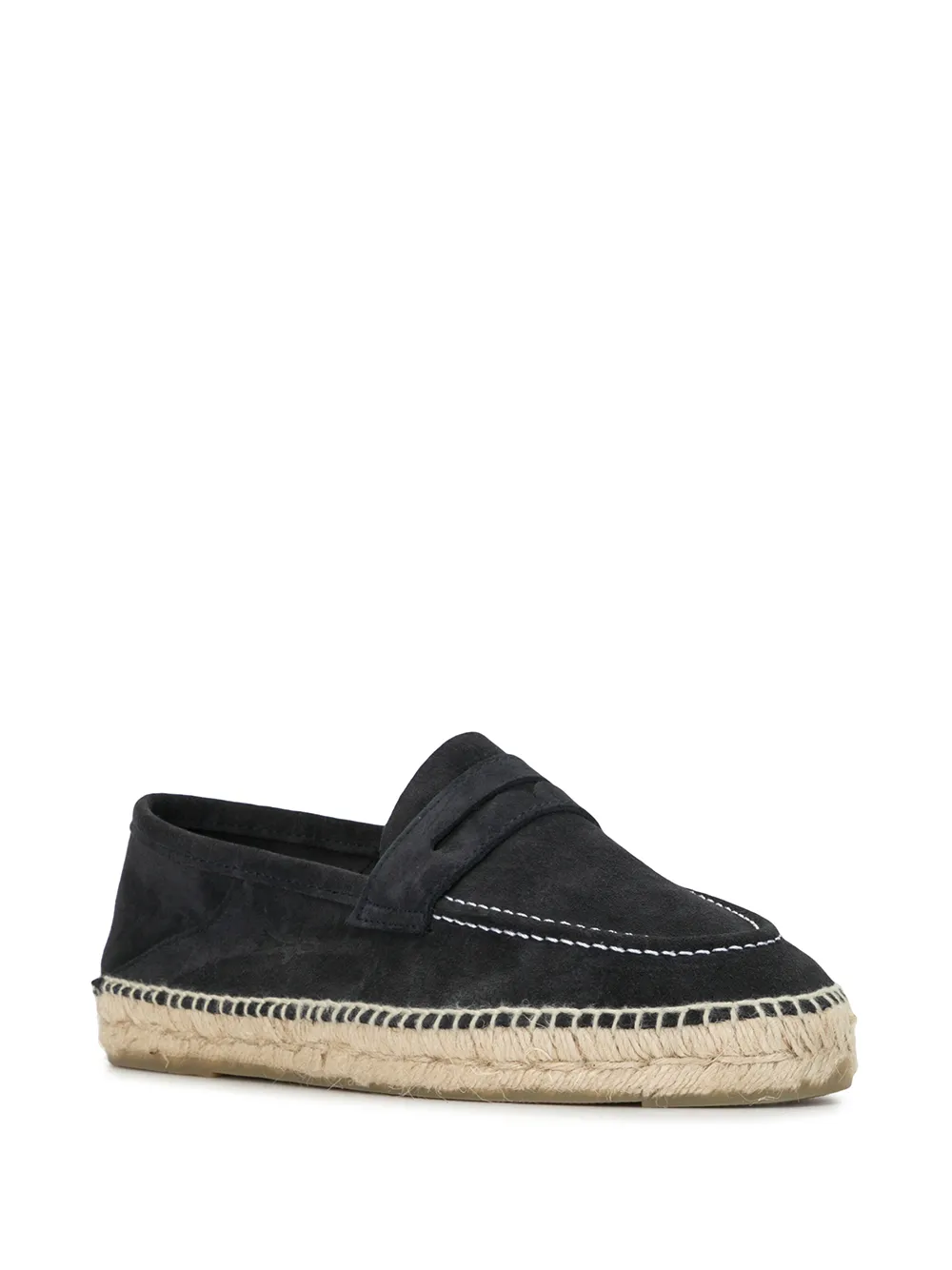 Black suede Hamptons collapsible-heel loafer espadrilles from Manebi featuring an exposed seam detail, stitching details, cut out details, a round toe, a braided raffia sole, a flat rubber sole and a collapsible heel counter.