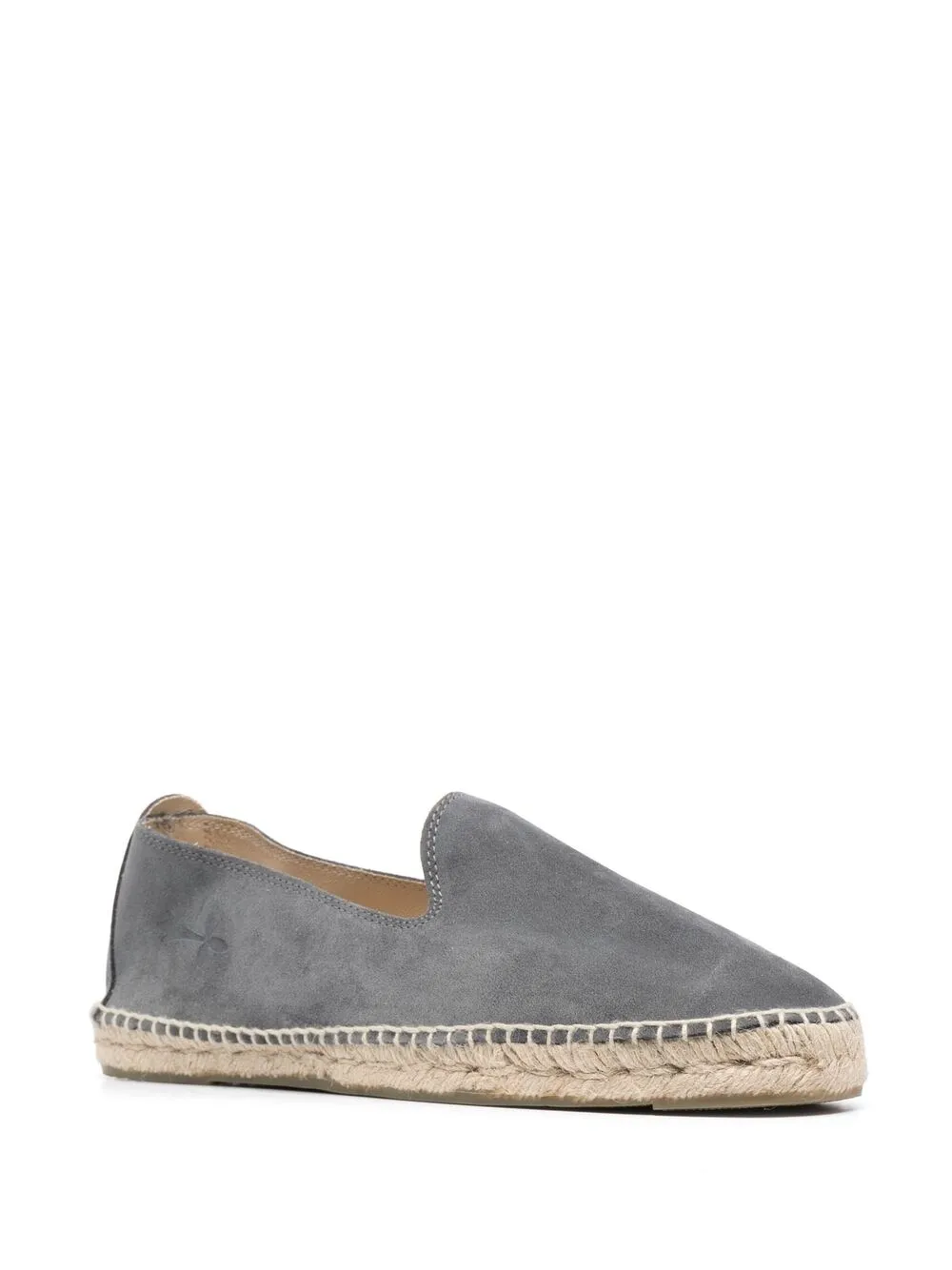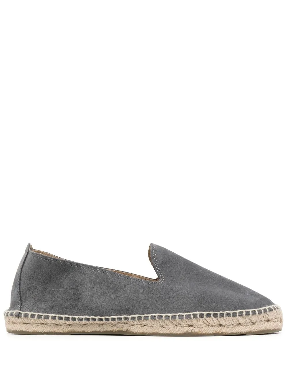 Carbon grey suede Hamptons espadrilles from MANEBI featuring braided raffia sole, round toe and branded insole.