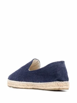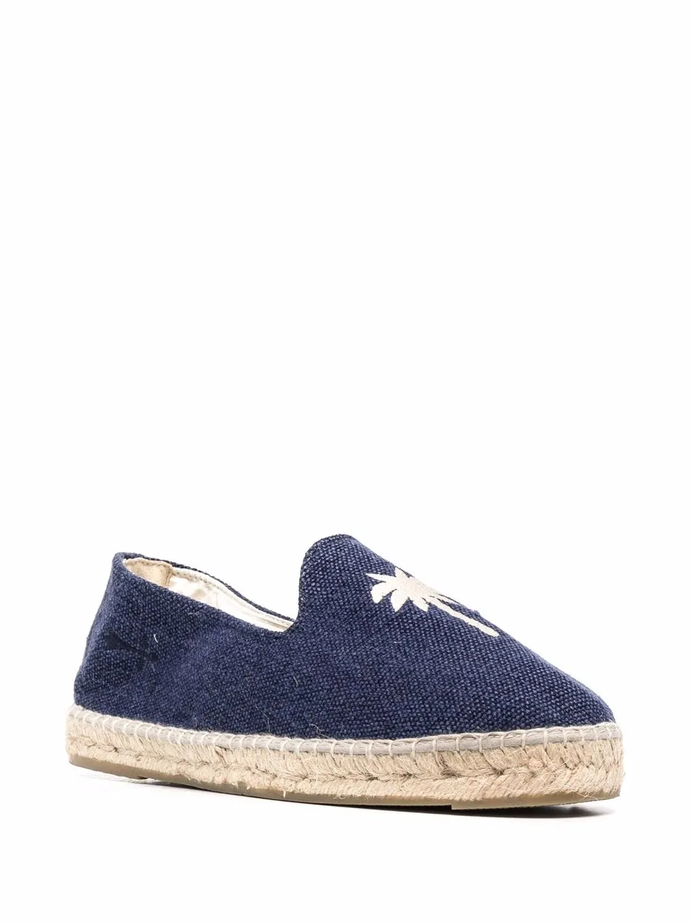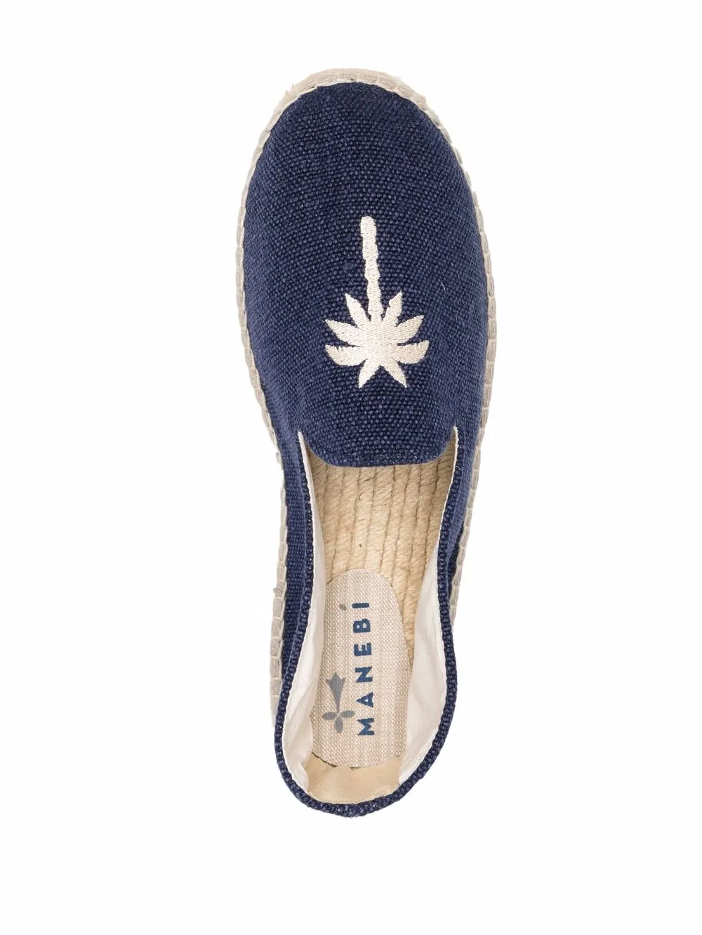 Navy blue/pale beige fabric Palm Springs embroidered espadrilles from MANEBI featuring palm tree print, round toe, slip-on style, branded insole and flat sole.