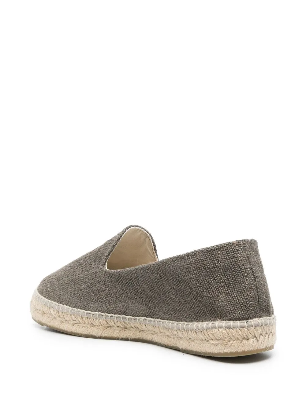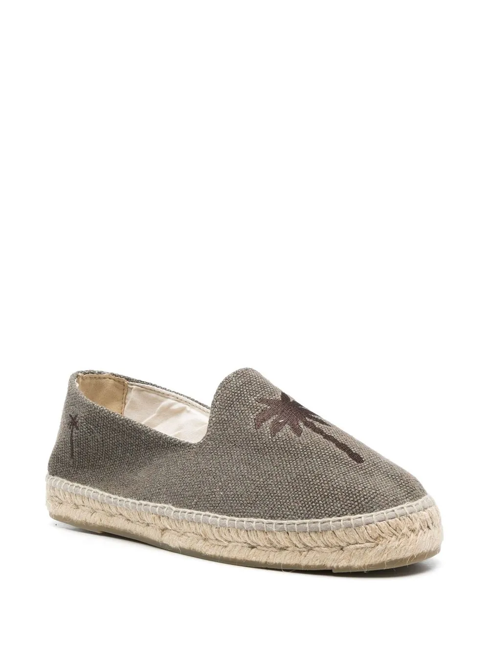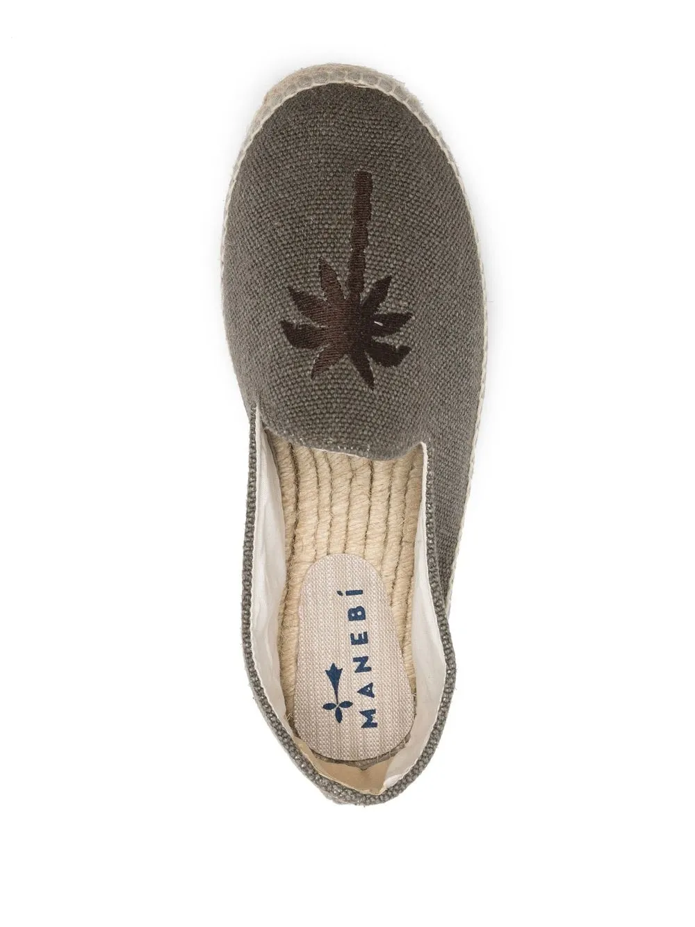 Palm Springs jute espadrilles from MANEBI featuring jute, palm tree print, decorative stitching, branded insole, slip-on style, round toe, braided raffia sole, flat rubber sole and military green.