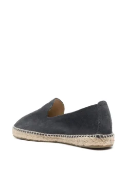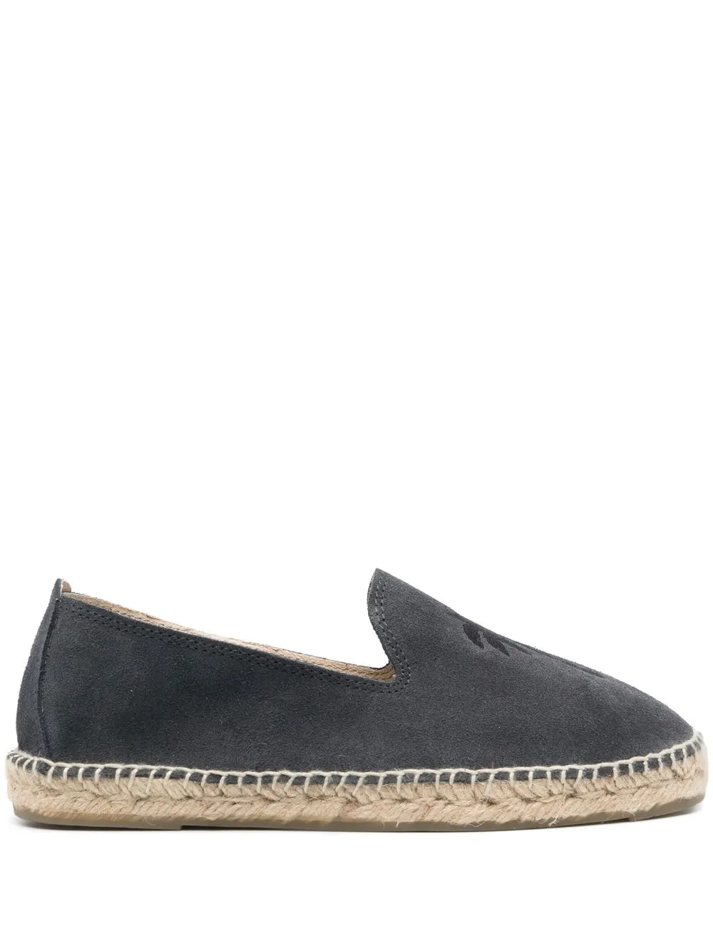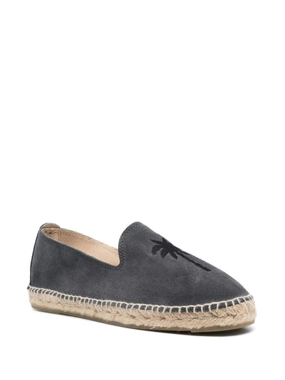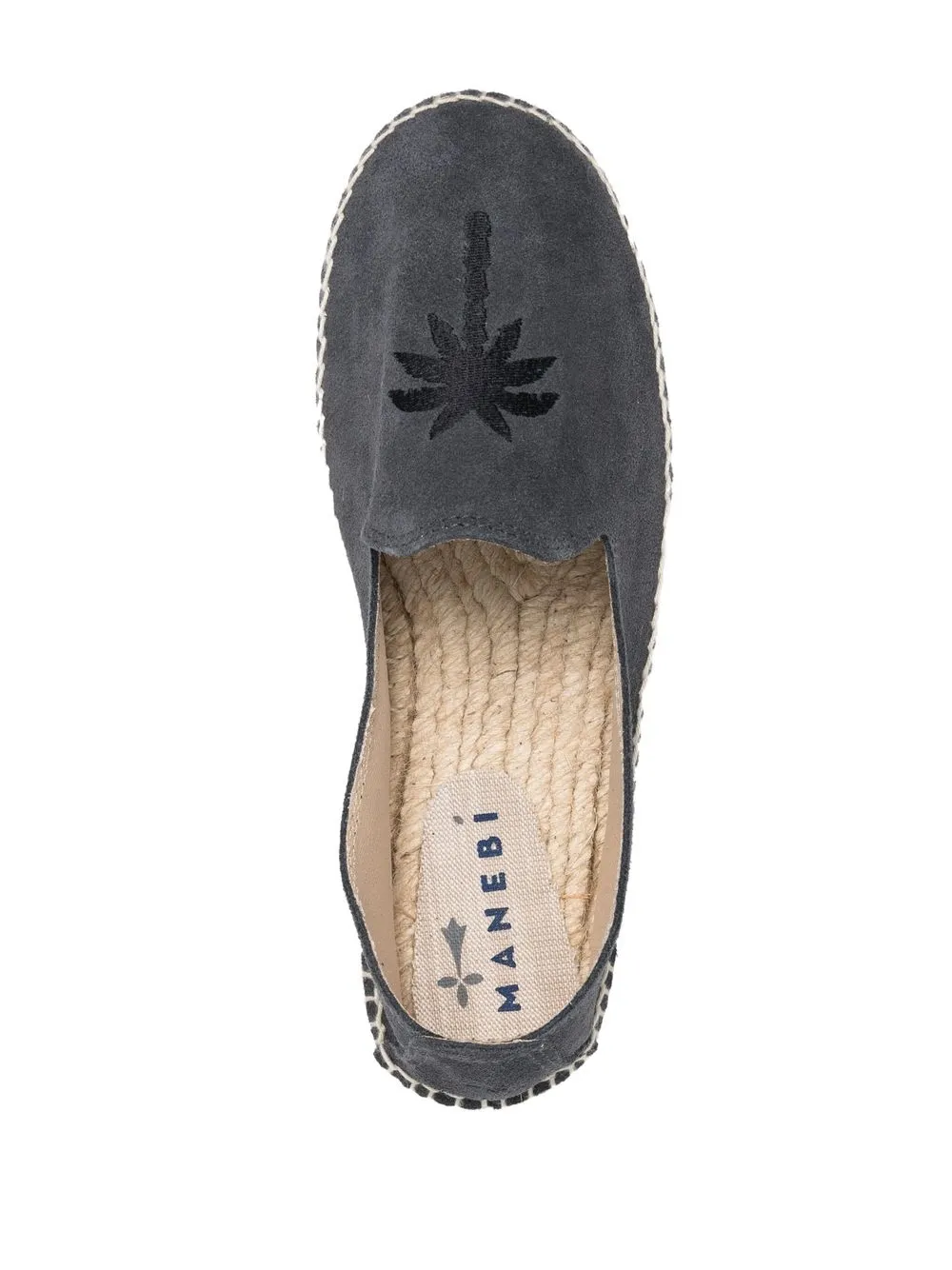 palm-tree embroidered espadrilles from MANEBI featuring dark grey, calf suede, jute, embroidered design, branded insole, round toe, slip-on style, braided raffia sole and flat sole.